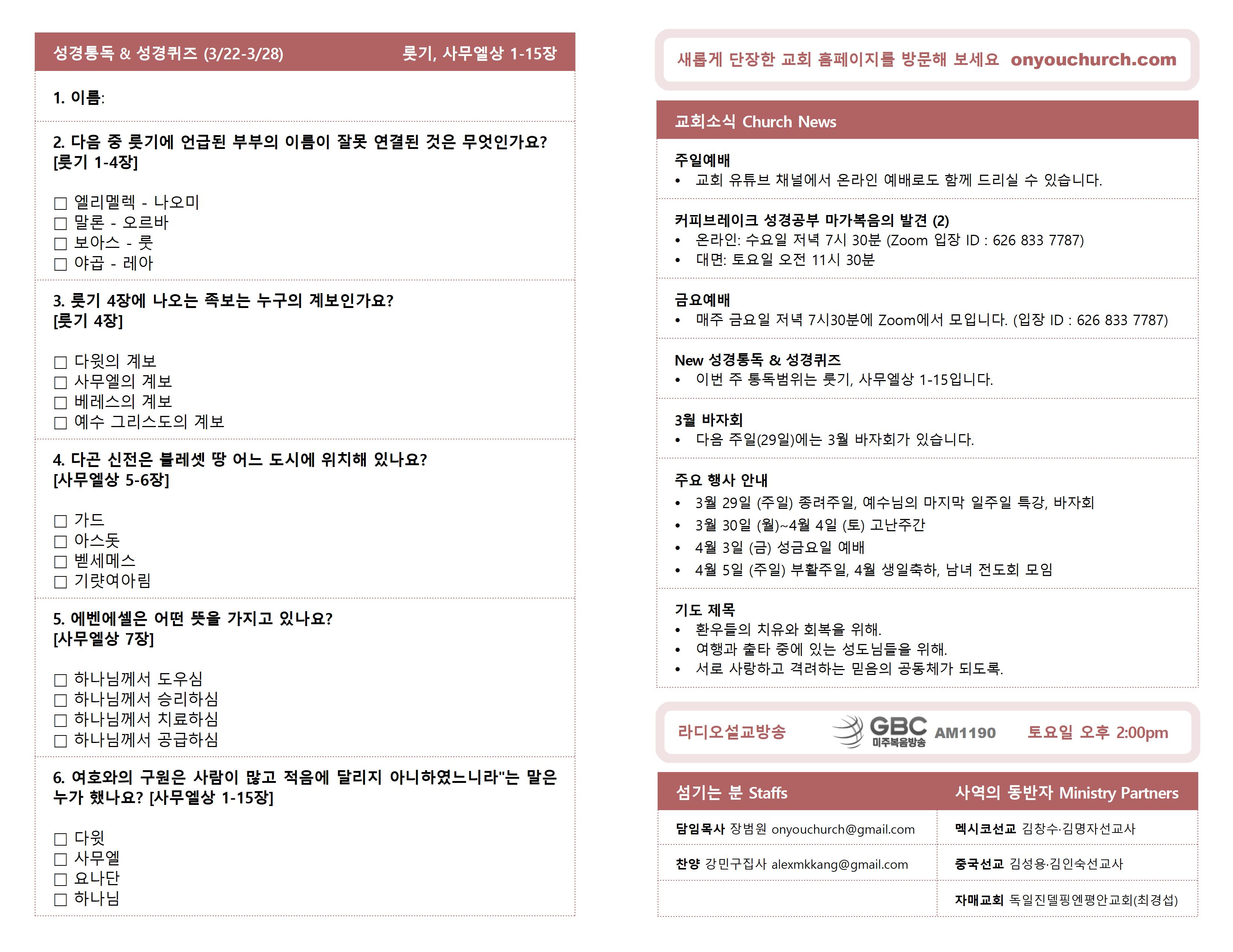 ◼ 이번 주 통독범위는 룻기, 사무엘상 1-15장입니다.