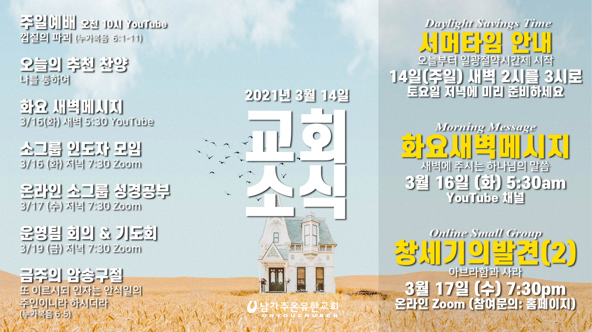 1. 오늘부터 일광절약시간제가 시작됩니다. 14일(주일) 새벽 2시를 3시로 조정해 주시기 바랍니다.