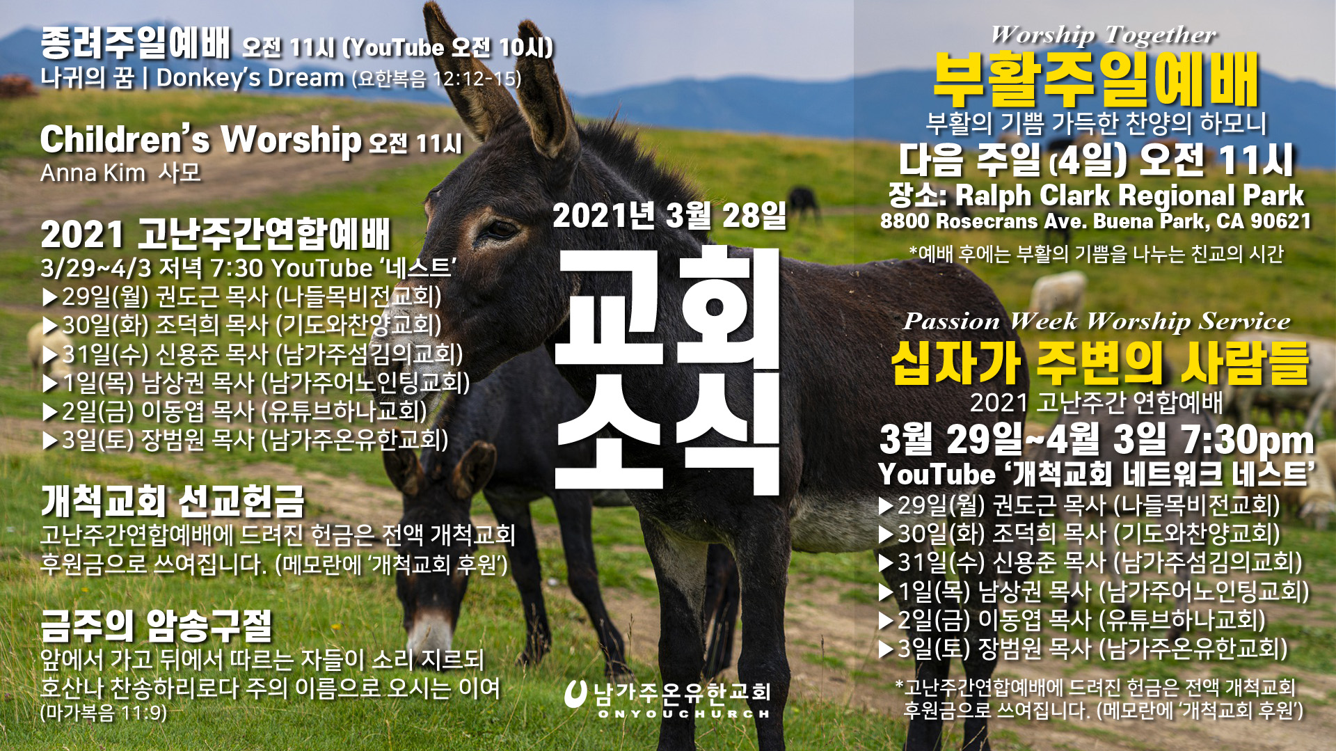 1. 오늘 종려주일예배는 부에나팍 지역 랄프클락공원에서 야외현장예배로 모입니다. 온라인예배는 오전 10시에 유튜브로 드립니다.
