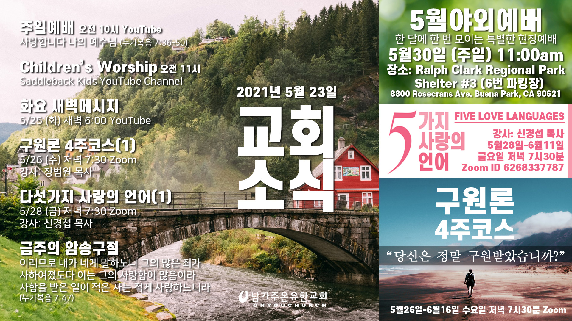 5. '다섯 가지 사랑의 언어' 특강이 5월 28일~6월 11일 (금) 저녁 7시30분에 Zoom에서 있습니다. 신경섭 목사님께서 강사로 섬겨주십니다. Zoom 입장 ID는 6268337787 이며, 7시15분부터 입장하실 수 있습니다. 여기를 누르시면 곧바로 참여하실 수 있습니다.