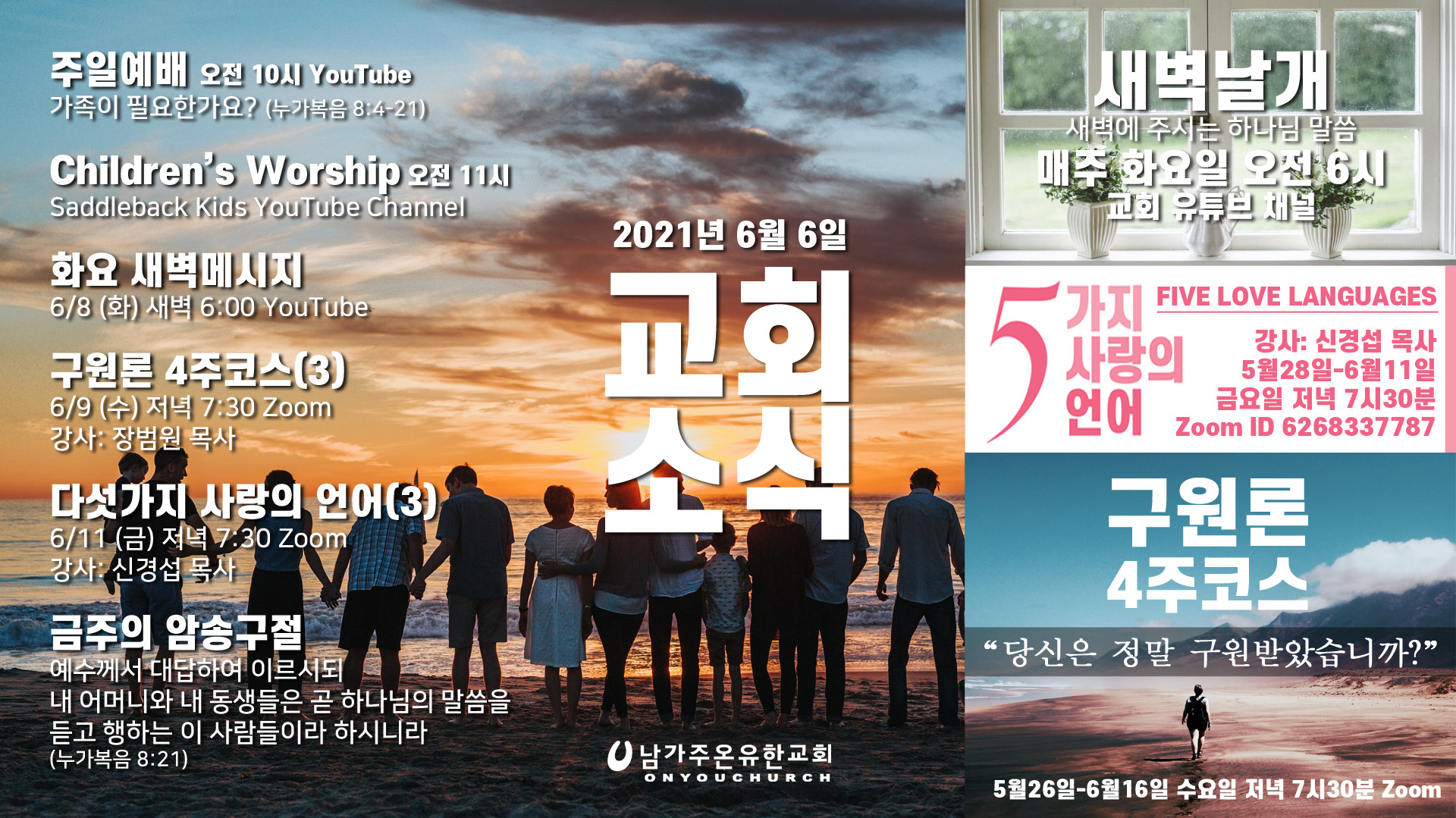 4. '다섯 가지 사랑의 언어' 특강이 5월 28일~6월 11일 (금) 저녁 7시30분에 Zoom에서 있습니다. 신경섭 목사님께서 강사로 섬겨주십니다. Zoom 입장 ID는 6268337787 이며, 7시15분부터 입장하실 수 있습니다. 여기를 누르시면 곧바로 참여하실 수 있습니다.