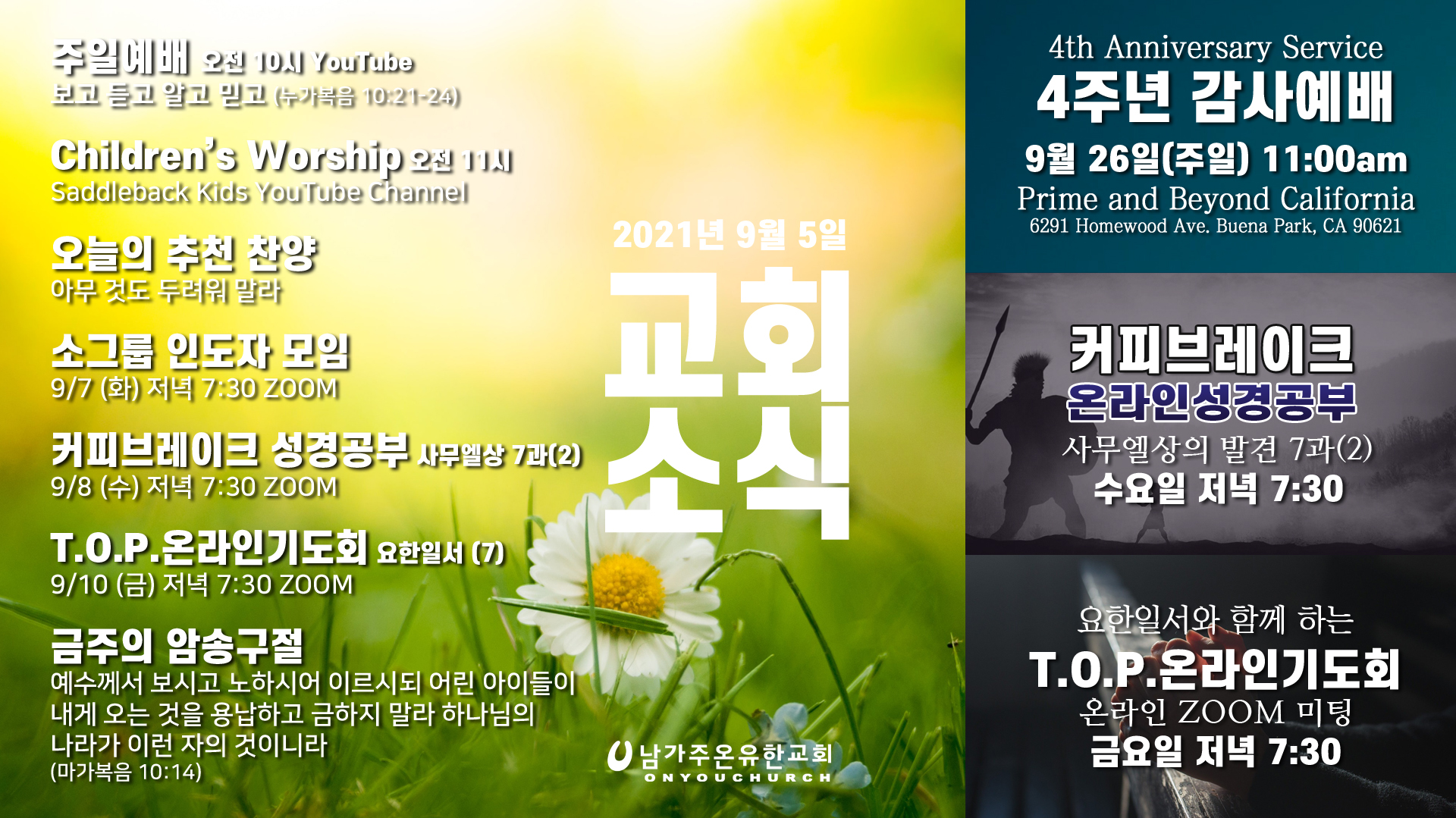 4. 요한일서와 함께 하는 T.O.P 온라인기도회가 매주 금요일 저녁 7시30분에 Zoom에서 있습니다.
