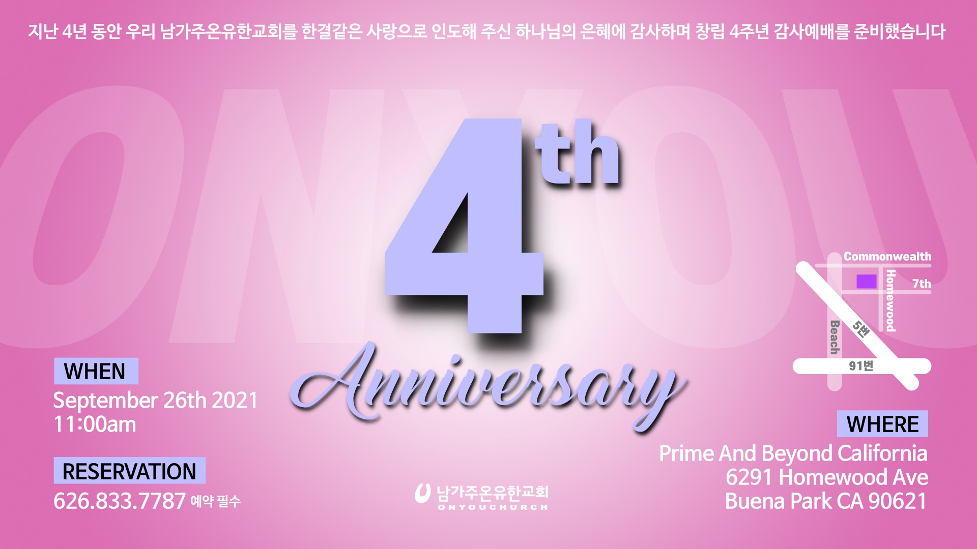 지년 4년 동안 우리 남가주온유한교회를 한결같은 사랑으로 인도해 주신 하나님의 은혜에 감사하며 창립 4주년 감사예배를 준비했습니다.