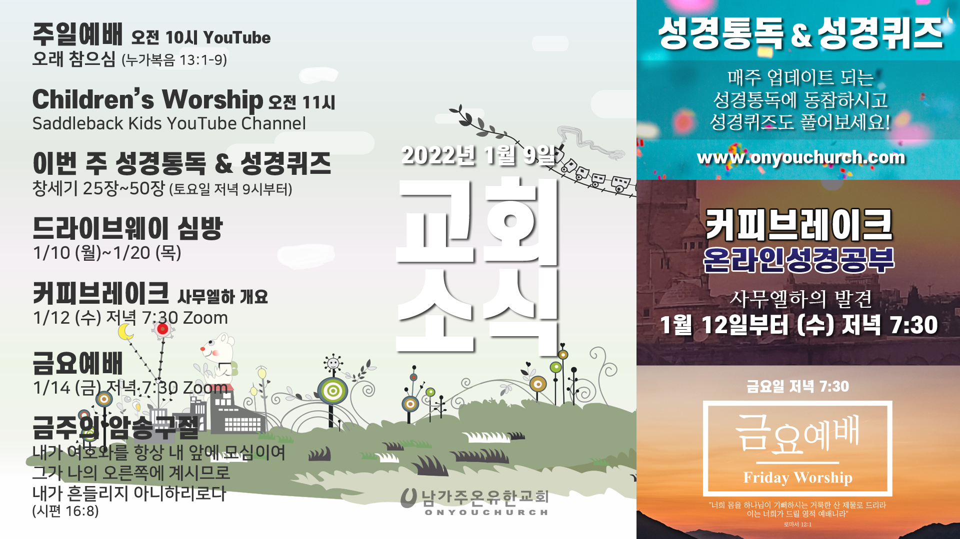 1. 오늘 주일예배는 온라인예배로 오전 10시 15분에 드립니다. 10시부터 기도로 준비하시기 바랍니다.