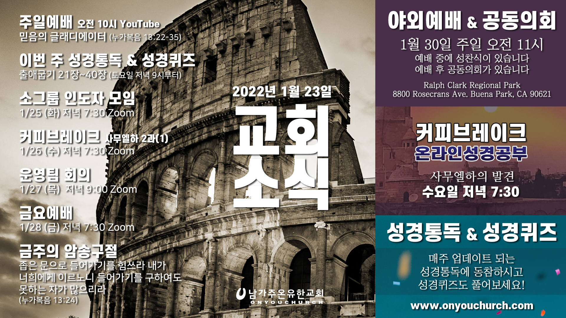 1. 오늘 주일예배는 온라인예배로 오전 10시 15분에 드립니다. 10시부터 기도로 준비하시기 바랍니다.