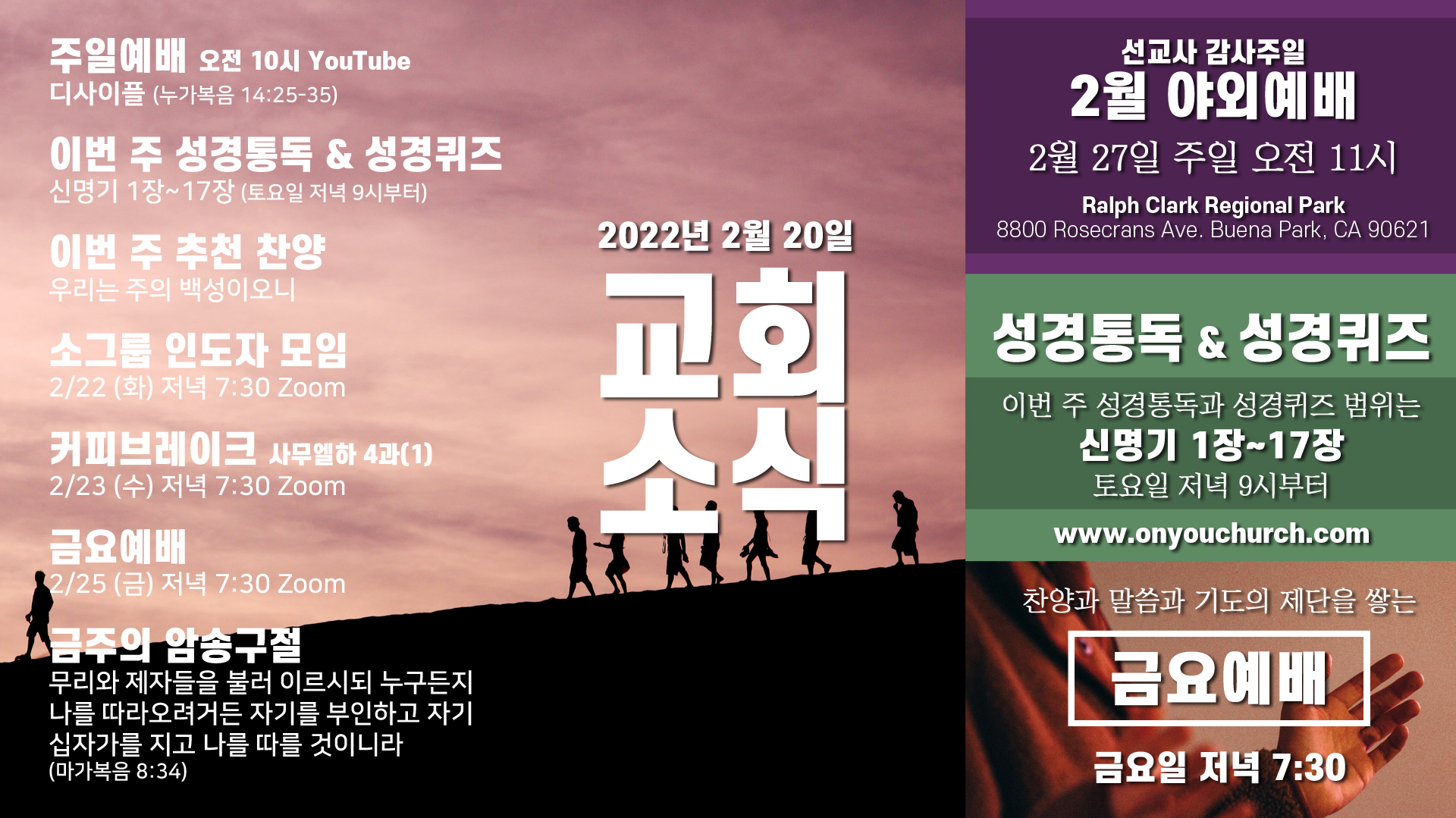 2. 다음 주일예배는 야외예배로 드립니다. 2월 마지막 주일은 선교사 감사주일로 지킵니다.