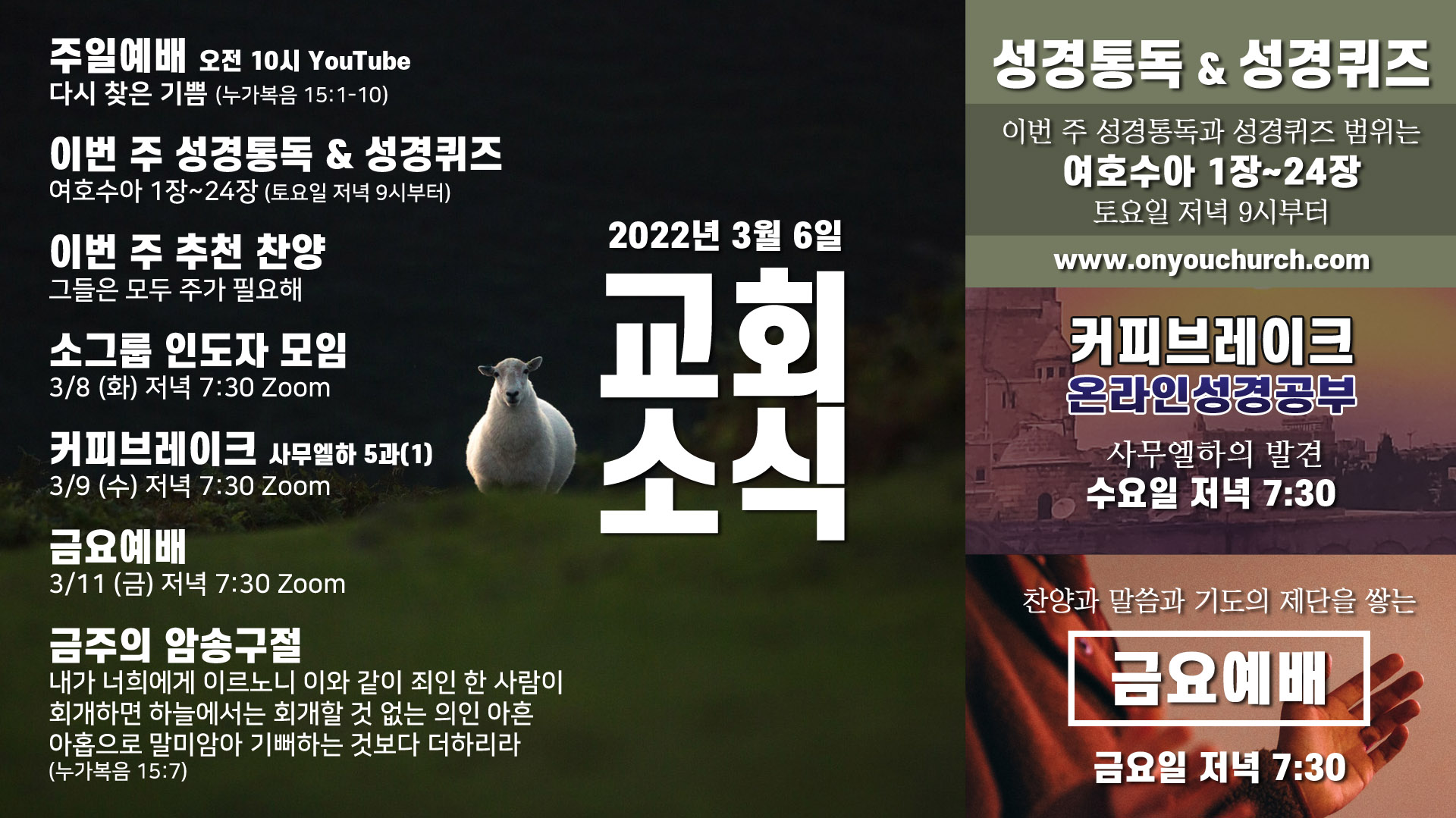 1. 오늘 주일예배는 온라인예배로 오전 10시 15분에 드립니다. 10시부터 기도로 준비하시기 바랍니다.