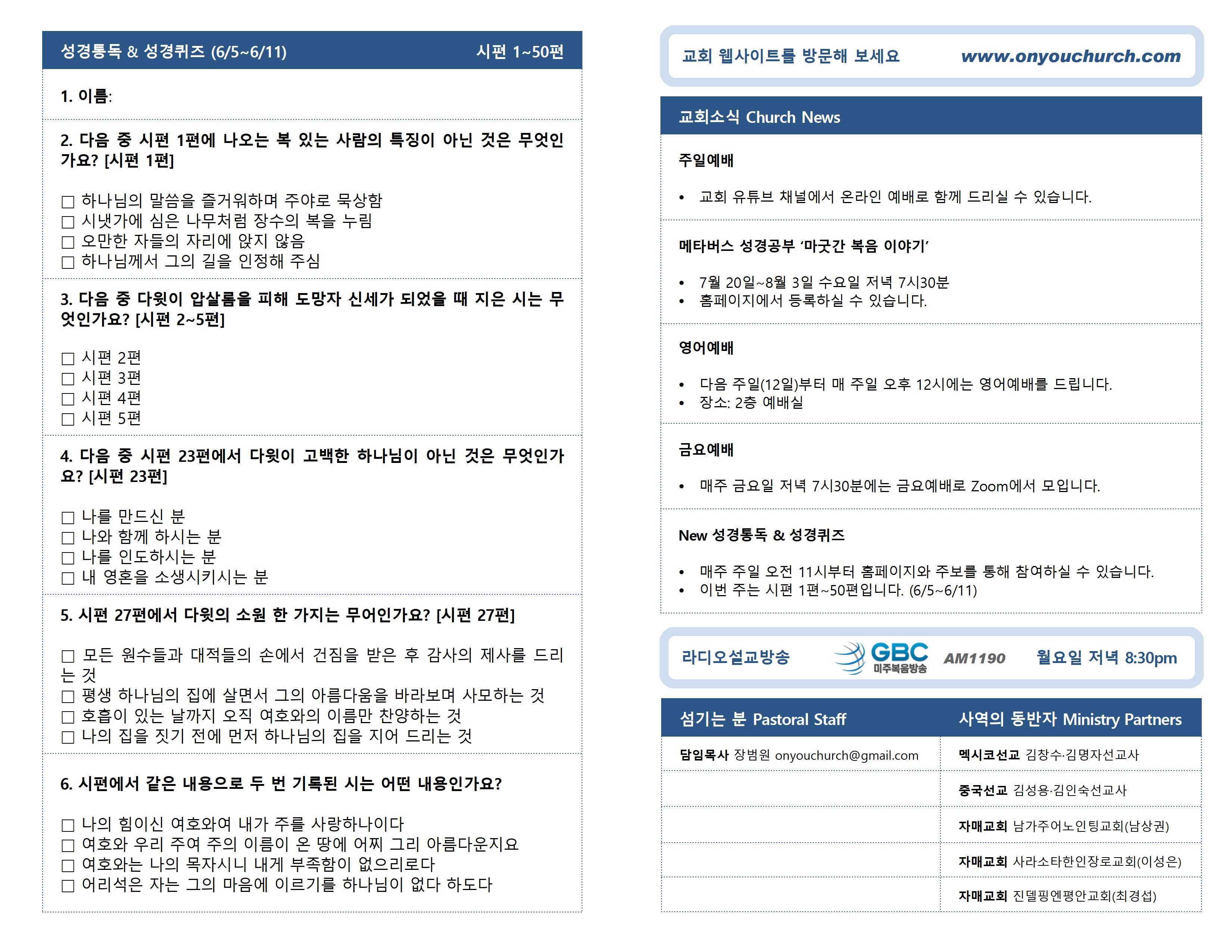 ◼이번 주는 시편 1편~50편입니다. (6/5~6/11)