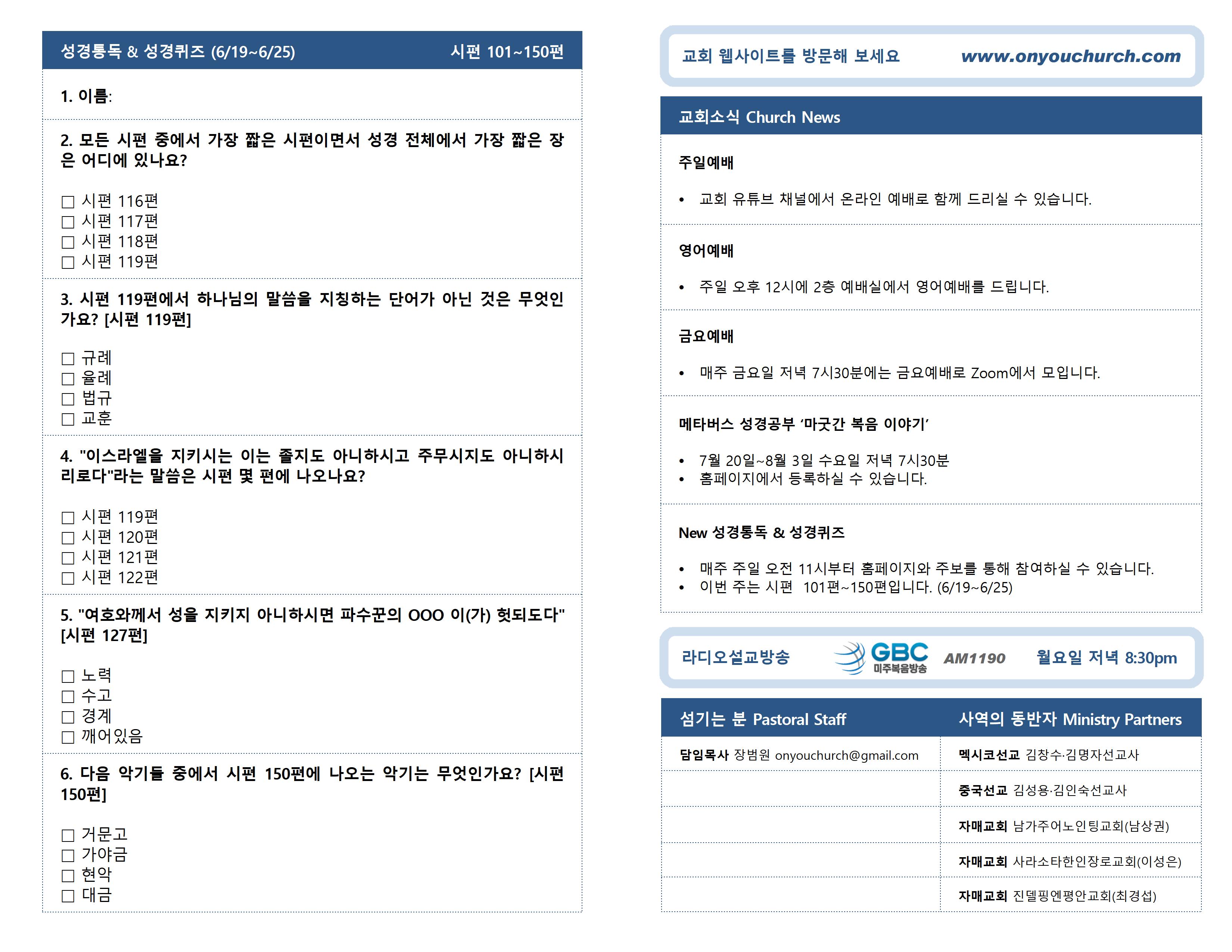 ◼이번 주는 시편 101편~150편입니다. (6/19~6/25)