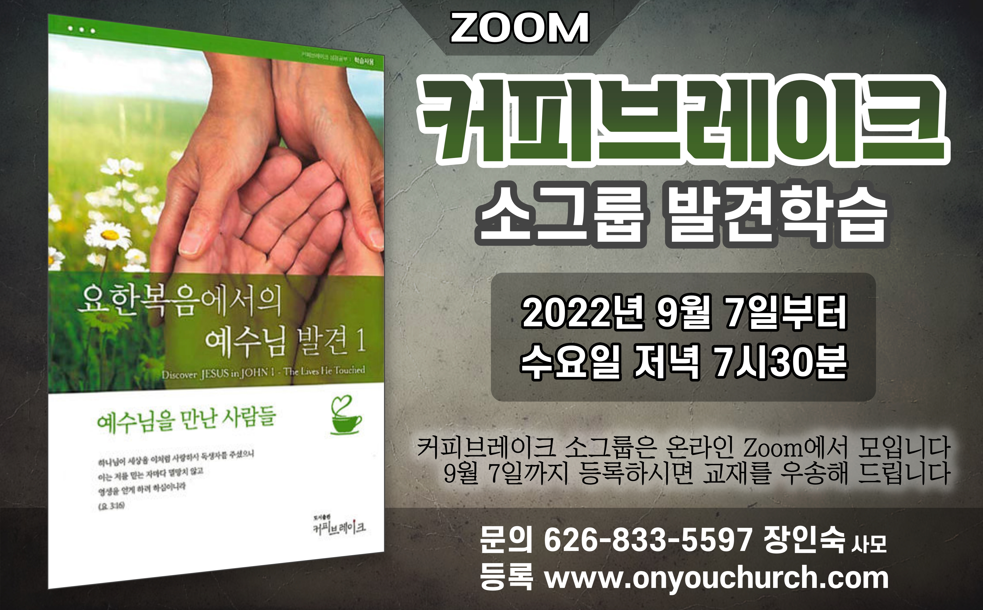 커피브레이크 - 요한복음에서의 예수님 발견 1 2022.09.15 16:12 양육과 성장/커피브레이크 발견학습 커피브레이크 소그룹 발견학습 가을확기 안내 일정: 2022년 9월 7일부터 시간: 수요일 저녁 7시 30분 장소: Zoom 교재: 요한복음에서의 예수님 발견 1 (예수님을 만난 사람들) 문의: 626-833-5597 (장인숙 사모) 이메일: persis0306@gmail.com *9월 7일까지 등록하신 분께는 교재를 우송해 드립니다 등록하기 공유하기 게시글 관리 남가주온유한교회 댓글 공유하기 다른 글 댓글 이 글 공유하기 구독하기 구독하기 카카오톡 카카오톡 라인 라인 트위터 트위터 Facebook Facebook 카카오스토리 카카오스토리 밴드 밴드 네이버 블로그 네이버 블로그 Pocket Pocket Evernote Evernote 다른 글 부활 Part I | 육체의 부활 | 성경은 몸의 부활에 관해서 무엇이라고 말하는가? 부활 Part I | 육체의 부활 | 성경은 몸의 부활에 관해서 무엇이라고 말하는가? 2022.12.16 요한복음 개요 | 커피브레이크 성경공부 요한복음 개요 | 커피브레이크 성경공부 2022.09.15 사무엘하 개요 | 커피브레이크 성경공부 사무엘하 개요 | 커피브레이크 성경공부 2022.05.08 사무엘하 커피브레이크 스케쥴 사무엘하 커피브레이크 스케쥴 2022.04.17 다른 글 더 둘러보기