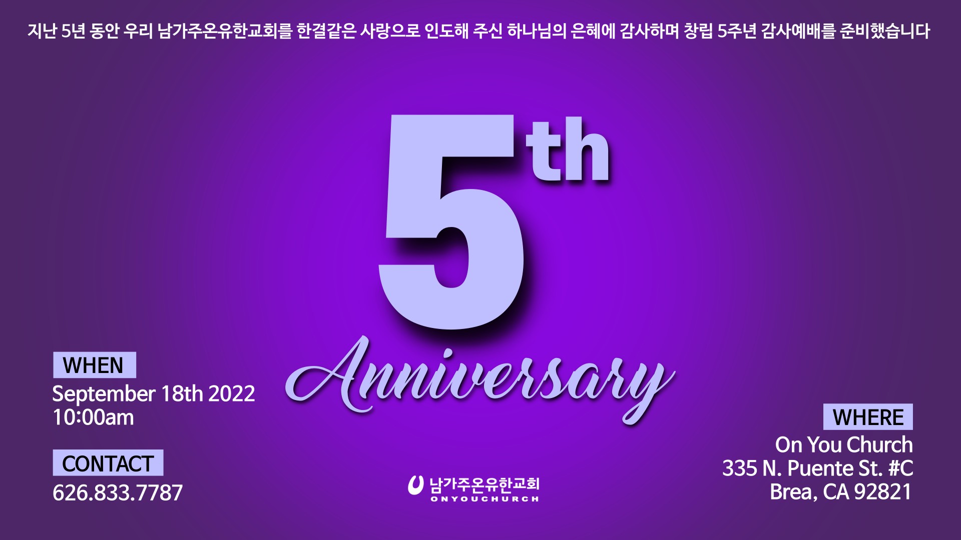 남가주온유한교회가 다섯 살이 되었습니다. 신실하신 하나님은 새로운 예배의 처소로 우리를 인도하셨습니다. 모든 감사와 영광을 받기에 합당하신 하나님께 최고의 예배를 올려드리기 원합니다.