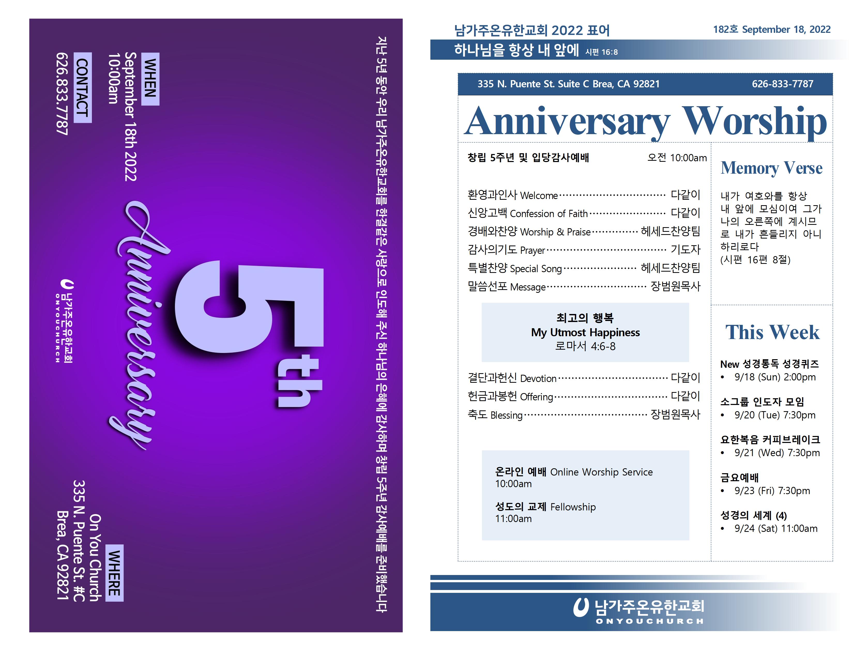 ◼창립 5주년 및 입당감사예베에 오신 여러분을 진심으로 환영하며 축복합니다. 또한 예배를 위해 여러 모양으로 섬겨 주신 성도님들께 감사의 마음을 전합니다.