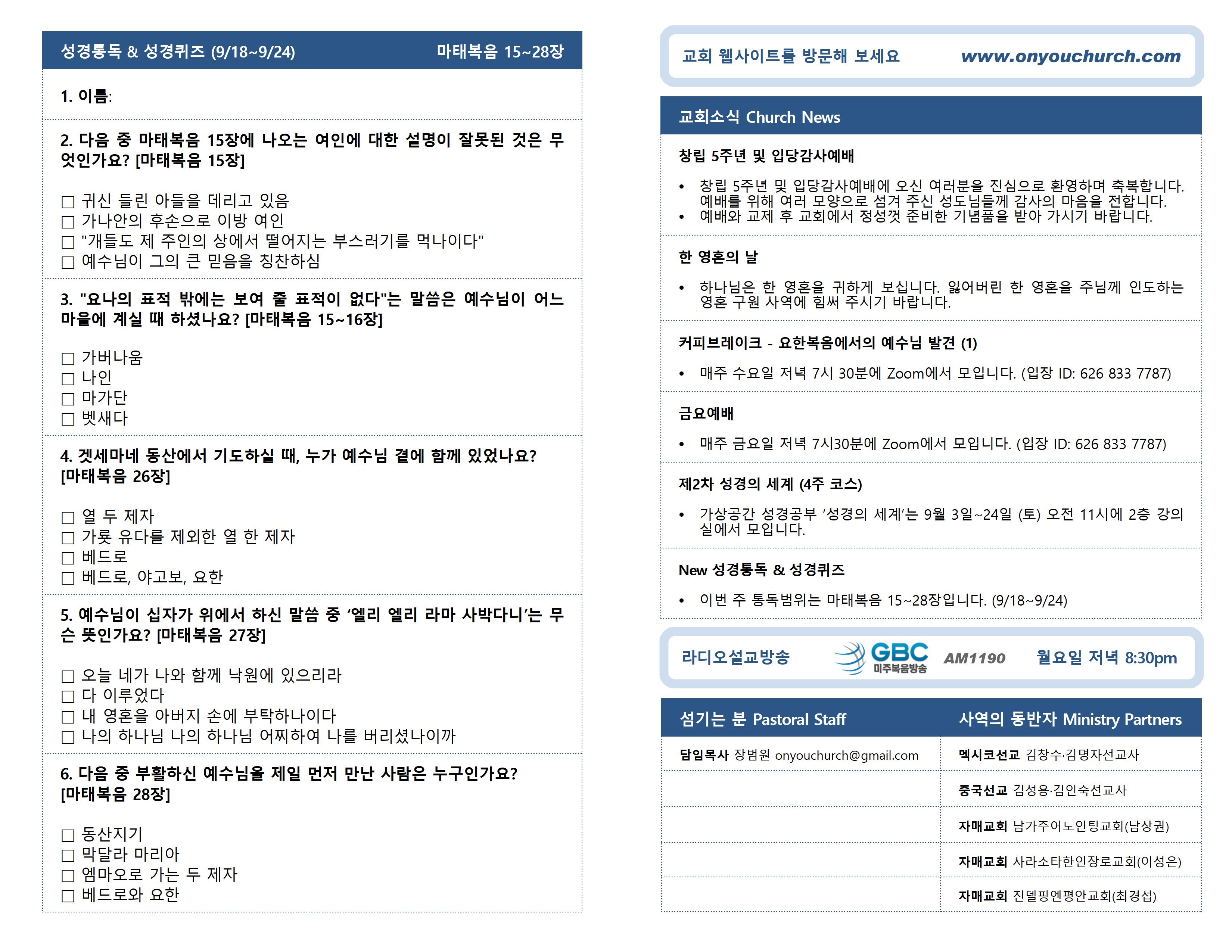◼이번 주는 통독 범위는 마태복음 15~28장입니다. (9/18~9/24)