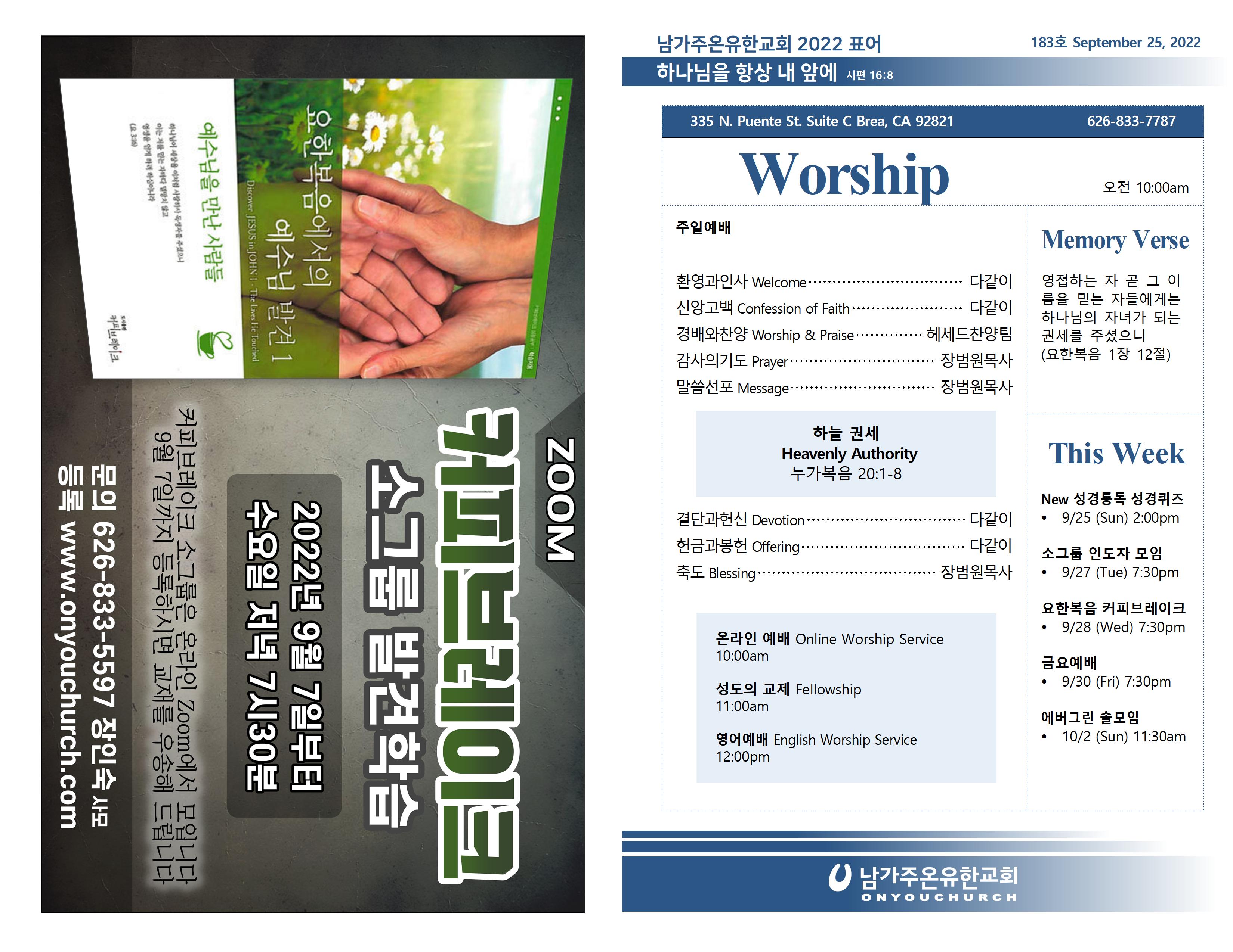 ◼이번 주는 통독 범위는 마가복음 1~16장입니다. (9/25~10/1)