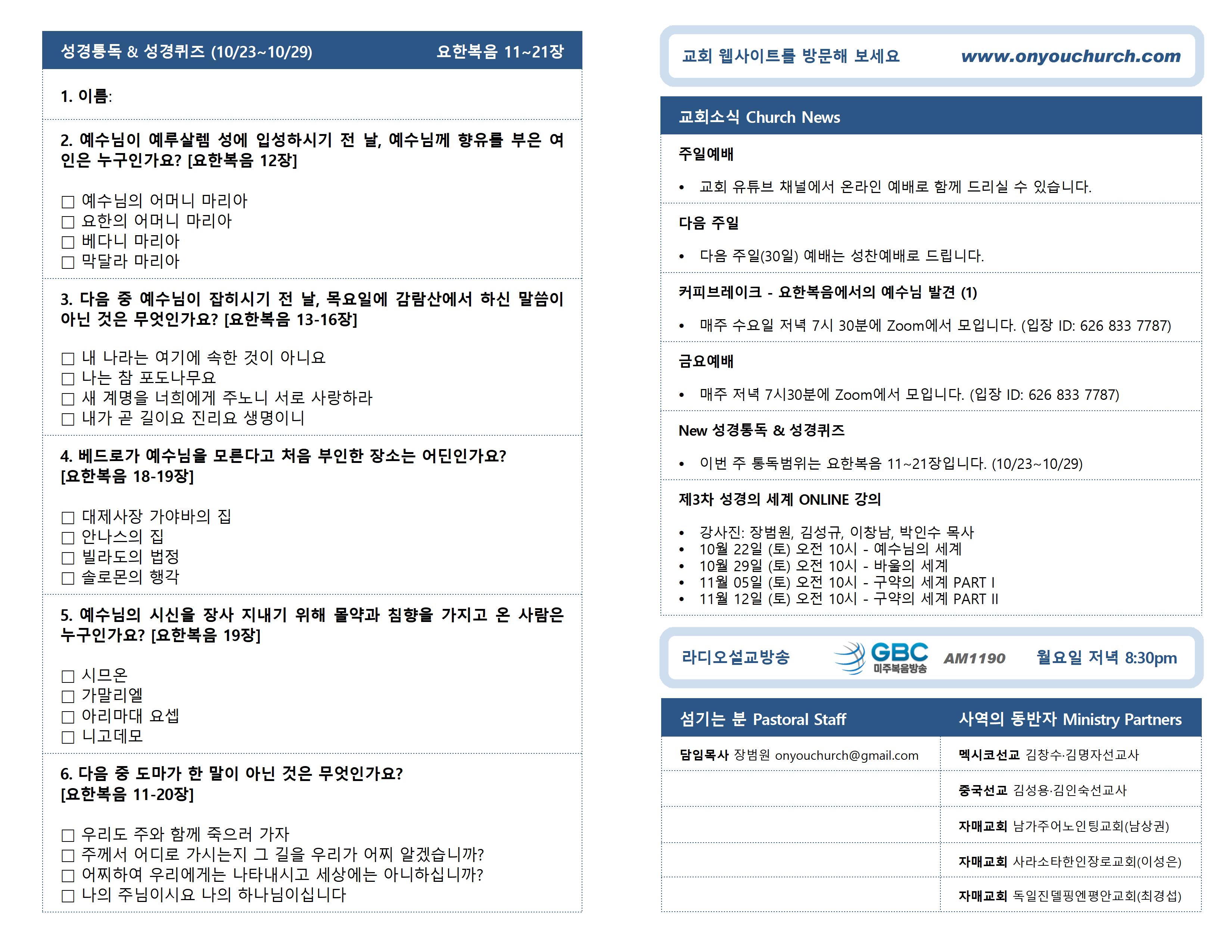 ◼이번 주는 통독 범위는 요한복음 11~21장입니다. (10/23~10/29)