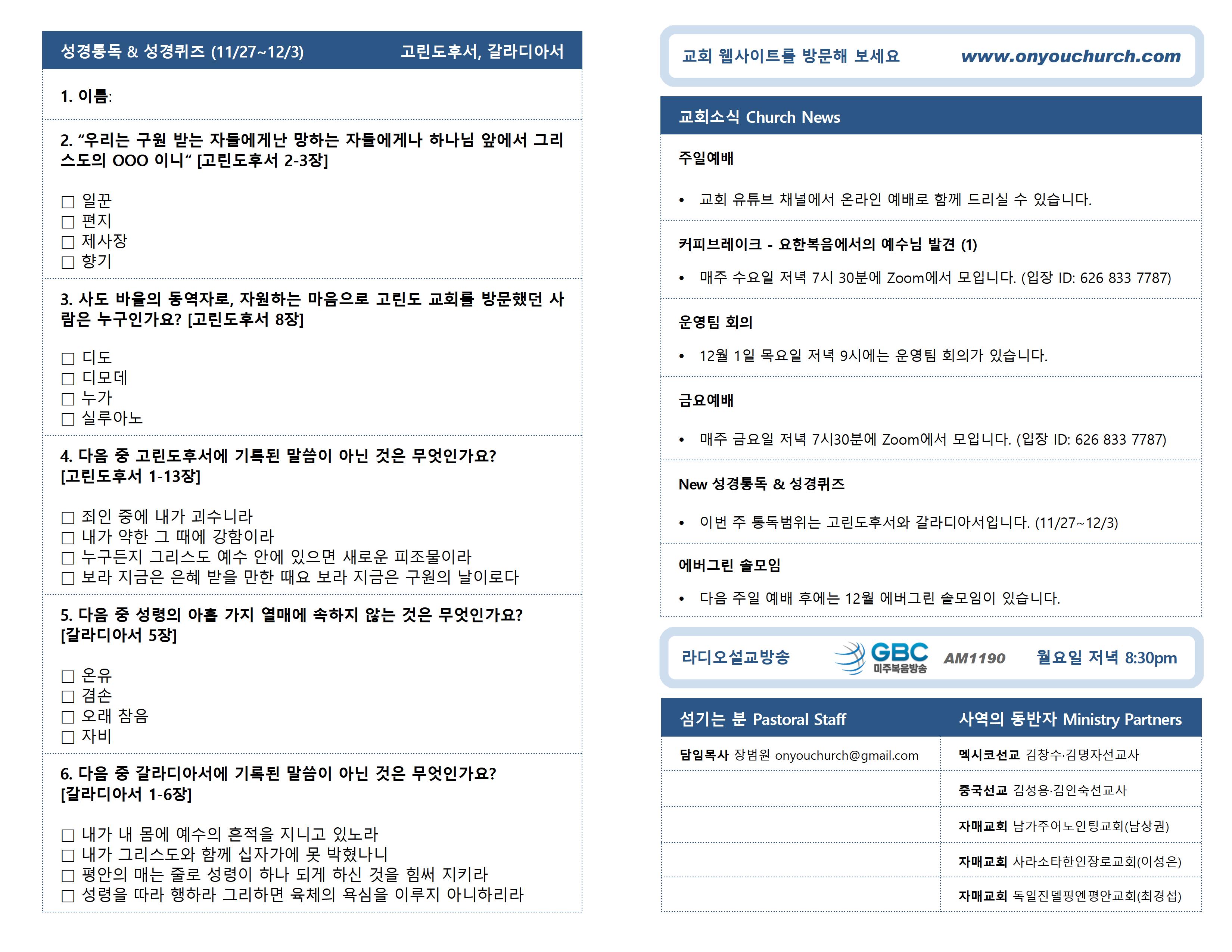 ◼이번 주는 통독 범위는 고린도후서와 갈라디아서입니다. (11/27~12/3)