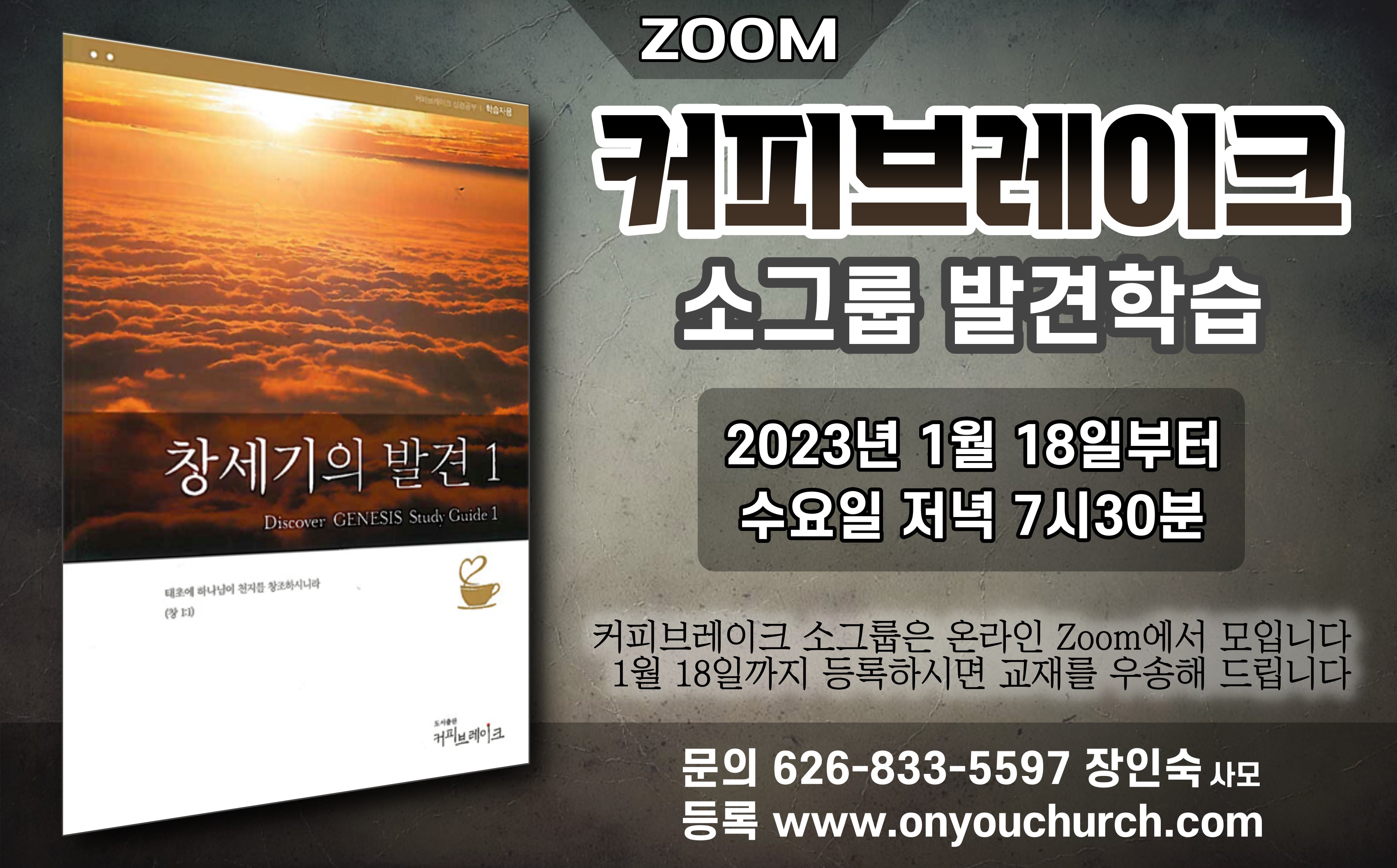 온라인 커피브레이크 - 창세기의 발견 1 2023.02.06 11:48 양육과 성장/커피브레이크 발견학습 커피브레이크 소그룹 발견학습 가을확기 안내 일정: 2023년 1월 18일부터 시간: 수요일 저녁 7시 30분 장소: Zoom 교재: 창세기의 발견 1 문의: 626-833-5597 (장인숙 사모) 이메일: persis0306@gmail.com *1월 18일까지 등록하신 분께는 교재를 우송해 드립니다 등록하기 공유하기 게시글 관리 남가주온유한교회 댓글 공유하기 다른 글 댓글 이 글 공유하기 구독하기 구독하기 카카오톡 카카오톡 라인 라인 트위터 트위터 Facebook Facebook 카카오스토리 카카오스토리 밴드 밴드 네이버 블로그 네이버 블로그 Pocket Pocket Evernote Evernote 다른 글 커피브레이크 창세기 (3) 개강 안내 커피브레이크 창세기 (3) 개강 안내 2023.09.03 영커플과 청년들을 위한 커피브레이크 - 요한계시록 영커플과 청년들을 위한 커피브레이크 - 요한계시록 2023.04.09 부활 Part II | 영혼수면설 | 천국과 낙원 | 이미 부활한 자들 | 나사로의 영혼의 행방 부활 Part II | 영혼수면설 | 천국과 낙원 | 이미 부활한 자들 | 나사로의 영혼의 행방 2022.12.31 부활 Part I | 육체의 부활 | 성경은 몸의 부활에 관해서 무엇이라고 말하는가? 부활 Part I | 육체의 부활 | 성경은 몸의 부활에 관해서 무엇이라고 말하는가? 2022.12.16 다른 글 더 둘러보기