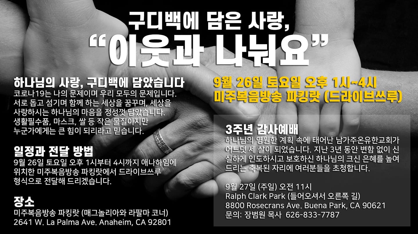 구디백에 담은 사랑, 이웃과 나눠요 2020.12.13 12:37 행사와 사진 백 번의 설교보다 더 큰 은혜가 있었습니다. 함께 동참해주신 성도님들과 이모양 저모양으로 섬겨주시고 찾아주신 분들 모두 진심으로 감사드립니다. 빠른 시일 내에 2차 나눔으로 다시 한번 주님의 사랑을 나누겠습니다. 그때는 좀 더 많이 준비해야겠지요? 공유하기 게시글 관리 남가주온유한교회 댓글 공유하기 다른 글 댓글 이 글 공유하기 구독하기 구독하기 카카오톡 카카오톡 라인 라인 트위터 트위터 Facebook Facebook 카카오스토리 카카오스토리 밴드 밴드 네이버 블로그 네이버 블로그 Pocket Pocket Evernote Evernote 다른 글 창립 4주년 기념예배 & 2부순서 창립 4주년 기념예배 & 2부순서 2021.09.27 헤세드찬양팀 헤세드찬양팀 2021.06.13 제2차 구디백에 담은 사랑, 이웃과 나눠요 제2차 구디백에 담은 사랑, 이웃과 나눠요 2020.12.13 개척교회와 미자립교회를 위한 사랑 나눔 개척교회와 미자립교회를 위한 사랑 나눔 2020.12.13 다른 글 더 둘러보기