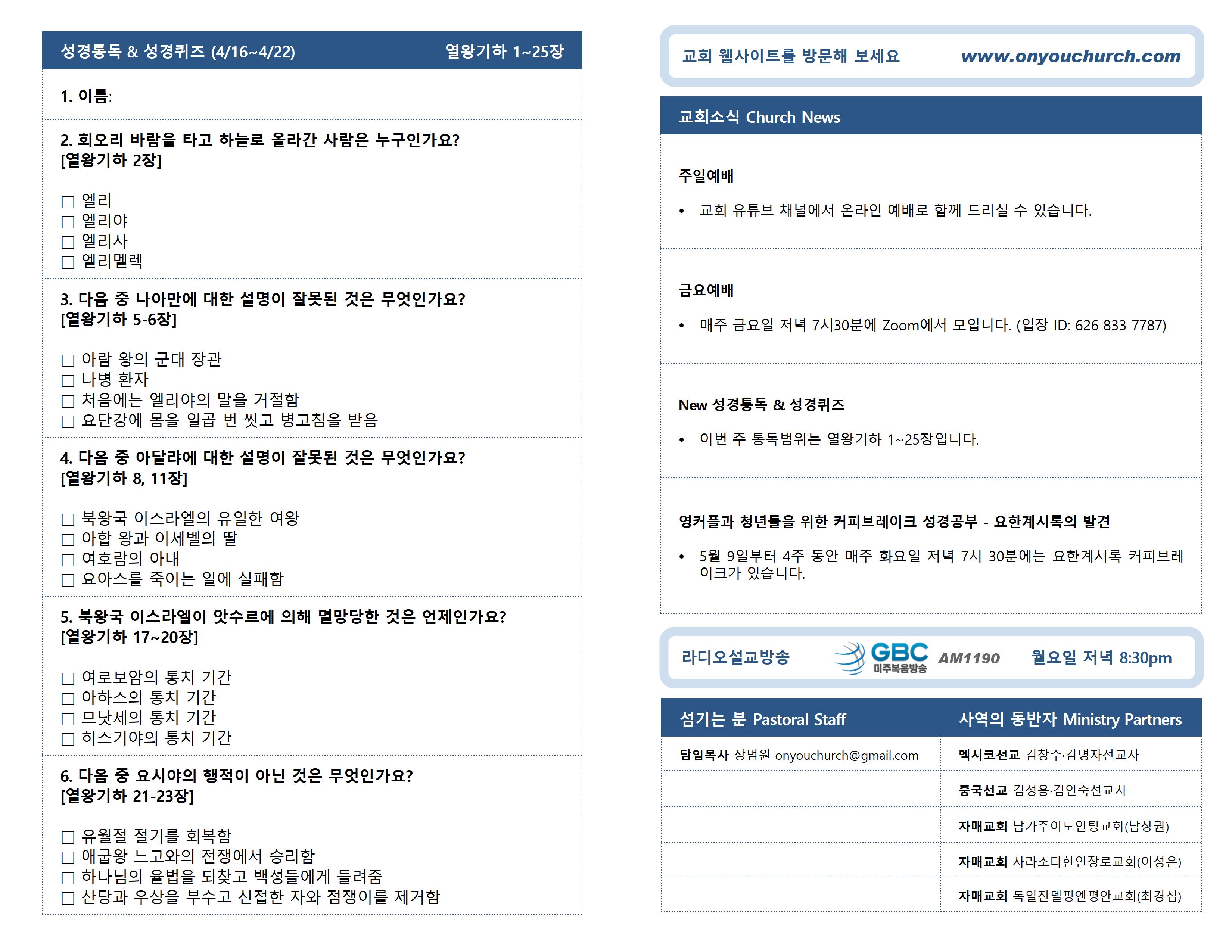 ◼이번 주 통독 범위는 열왕기하 1~25장입니다.