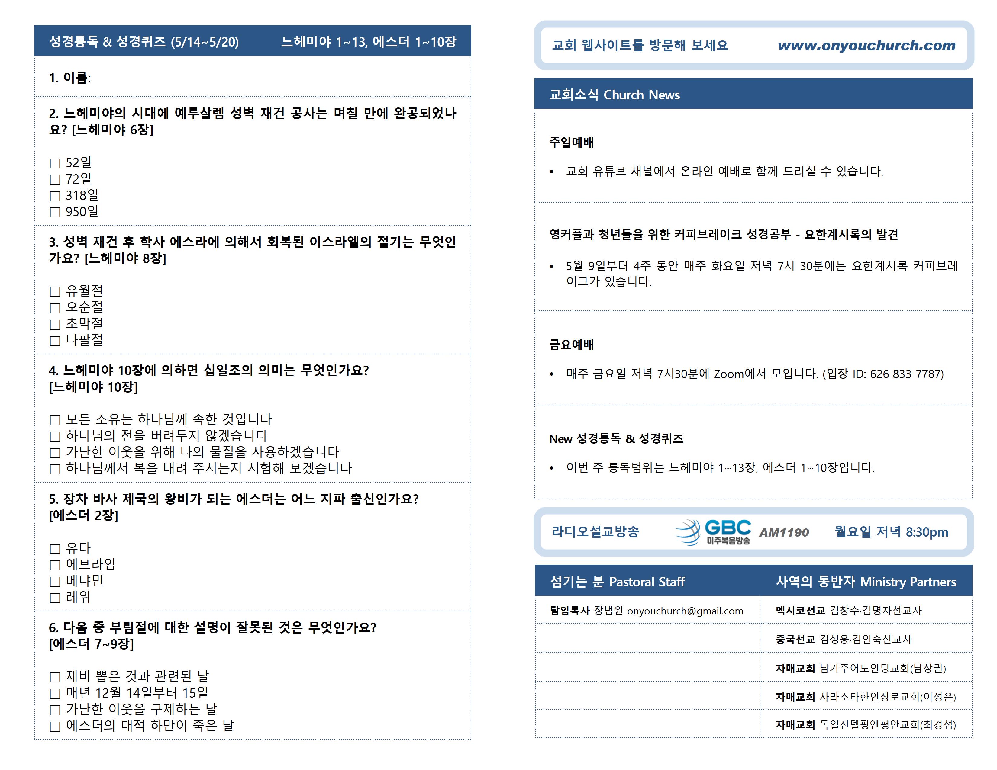 ◼이번 주 통독 범위는 느헤미야 1~13장, 에스더 1~10장입니다.