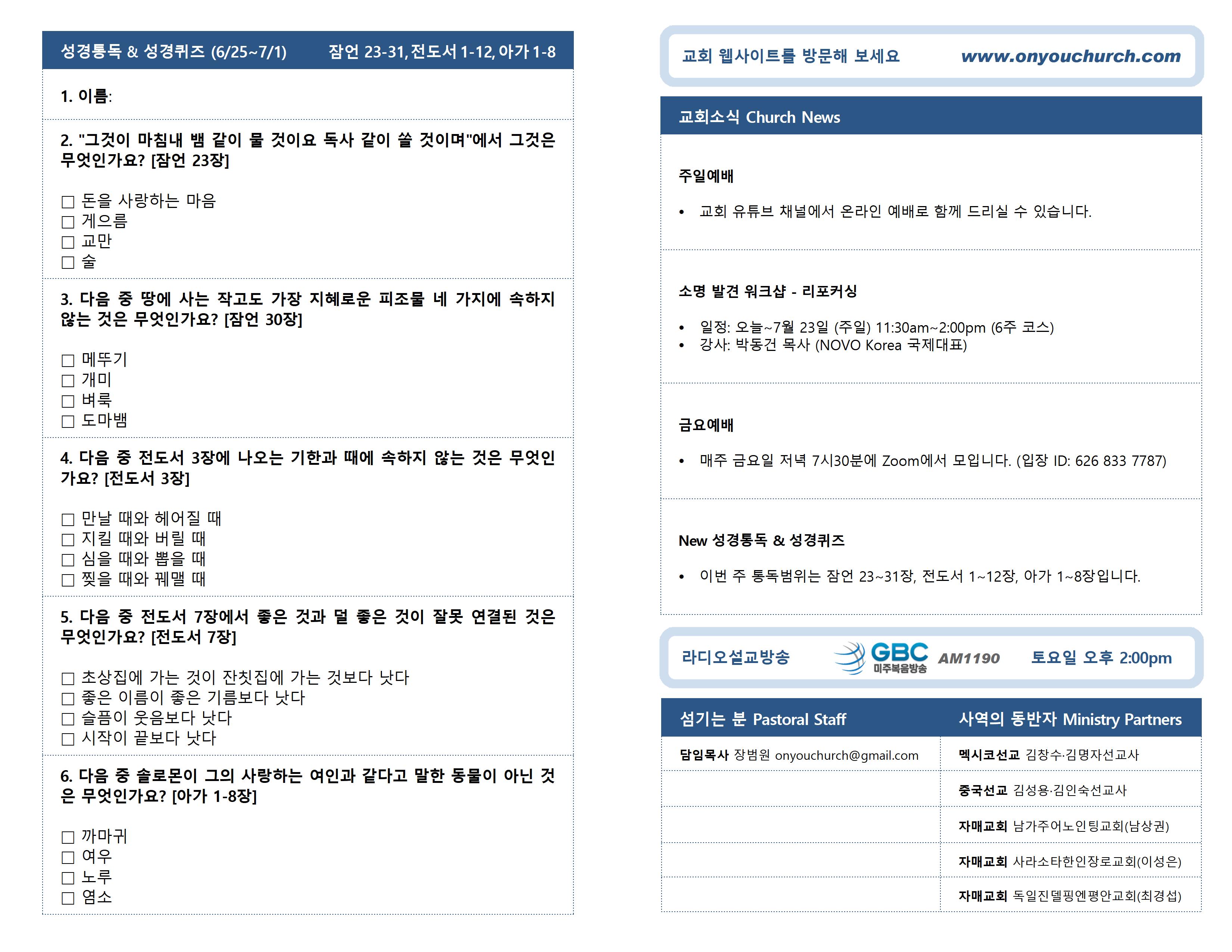 ◼이번 주 통독 범위는 잠언 23~31장, 전도서 1~12장, 아가 1~8장입니다.