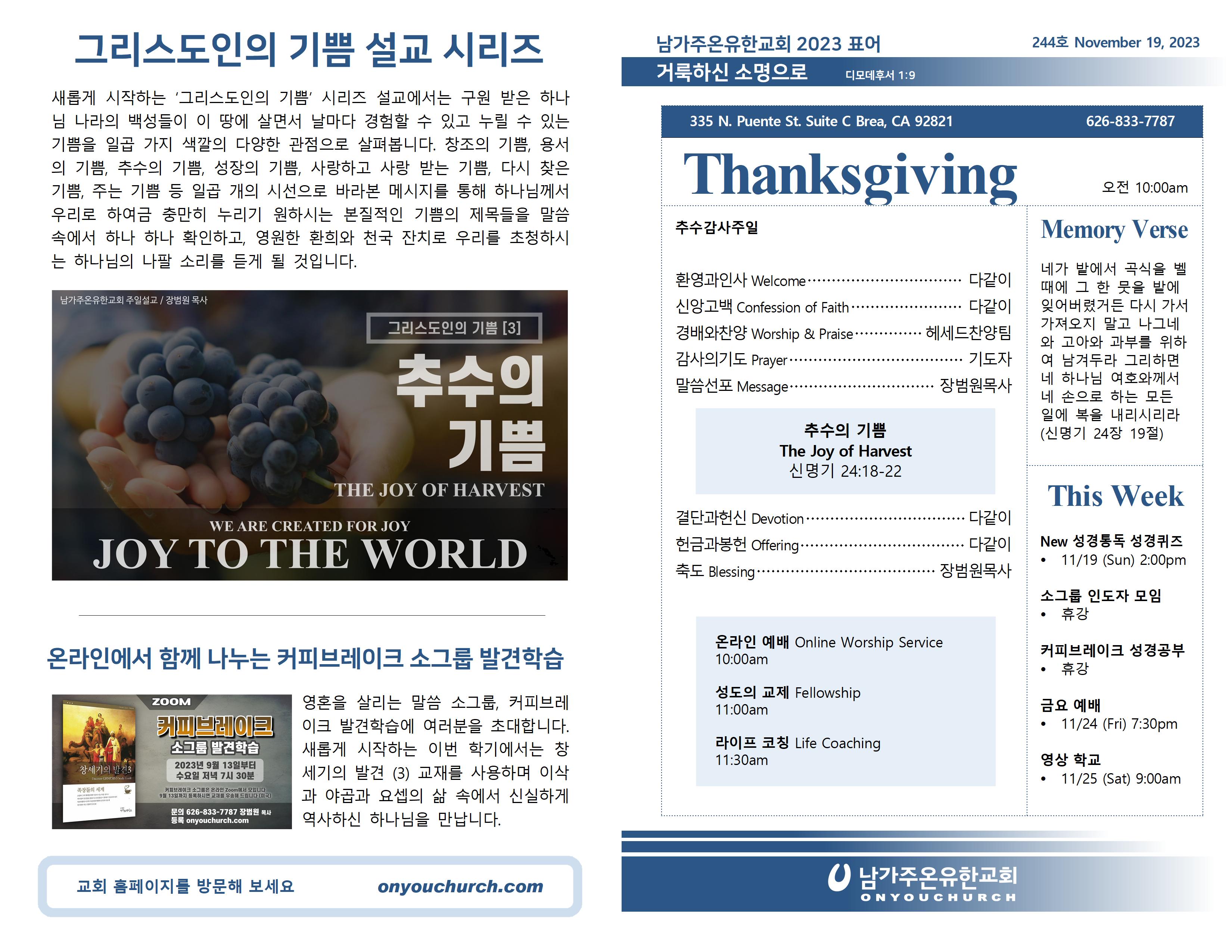 ◼ 추수감사절을 맞아서 이번 주 소그룹 인도자 모임은 휴강합니다.