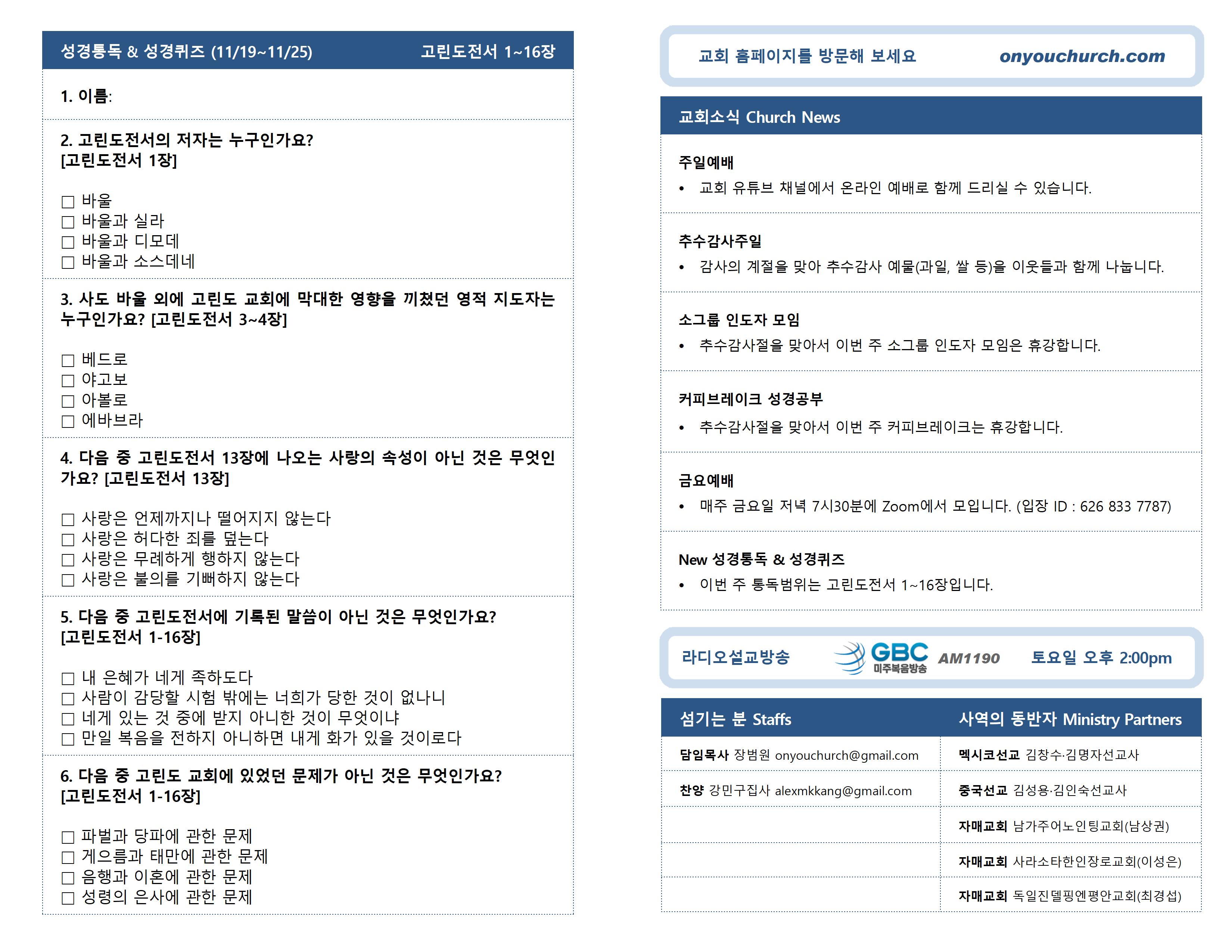 ◼ 추수감사절을 맞아서 이번 주 소그룹 인도자 모임은 휴강합니다.