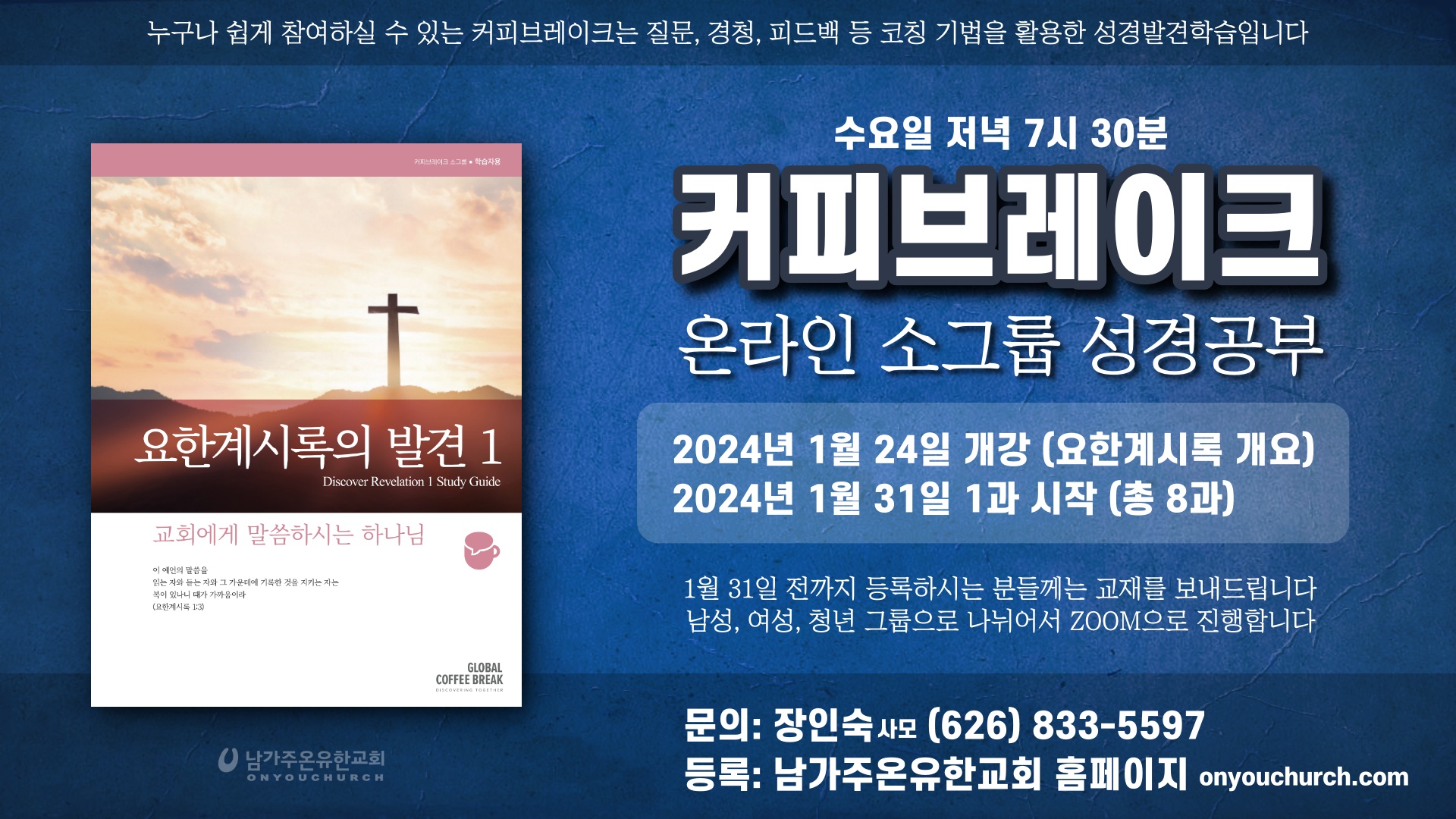 요한계시록 커피브레이크 온라인 성경공부 2024.01.03 09:20 양육과 성장/커피브레이크 발견학습 커피브레이크 소그룹 성경공부 일정: 2024년 1월 24일 개요, 1월 31일부터 8주 코스 시간: 수요일 저녁 7시 30분 (미서부 시간) 장소: Zoom 교재: 요한계시록의 발견 (1) 문의: 626-833-5597 (장인숙 사모) 이메일: onyouchurch@gmail.com 1월 31일 전까지 등록하신 분께는 교재를 우송해 드립니다. 아래 버튼을 누르시면 등록 페이지로 이동합니다. 공유하기 게시글 관리 남가주온유한교회 댓글 공유하기 다른 글 댓글 이 글 공유하기 구독하기 구독하기 카카오톡 카카오톡 라인 라인 트위터 트위터 Facebook Facebook 카카오스토리 카카오스토리 밴드 밴드 네이버 블로그 네이버 블로그 Pocket Pocket Evernote Evernote 다른 글 2025 커피브레이크 등록 안내 2025 커피브레이크 등록 안내 2025.08.03 커피브레이크 느헤미야 등록 커피브레이크 느헤미야 등록 2024.09.22 커피브레이크 창세기 (3) 개강 안내 커피브레이크 창세기 (3) 개강 안내 2023.09.03 영커플과 청년들을 위한 커피브레이크 - 요한계시록 영커플과 청년들을 위한 커피브레이크 - 요한계시록 2023.04.09 다른 글 더 둘러보기