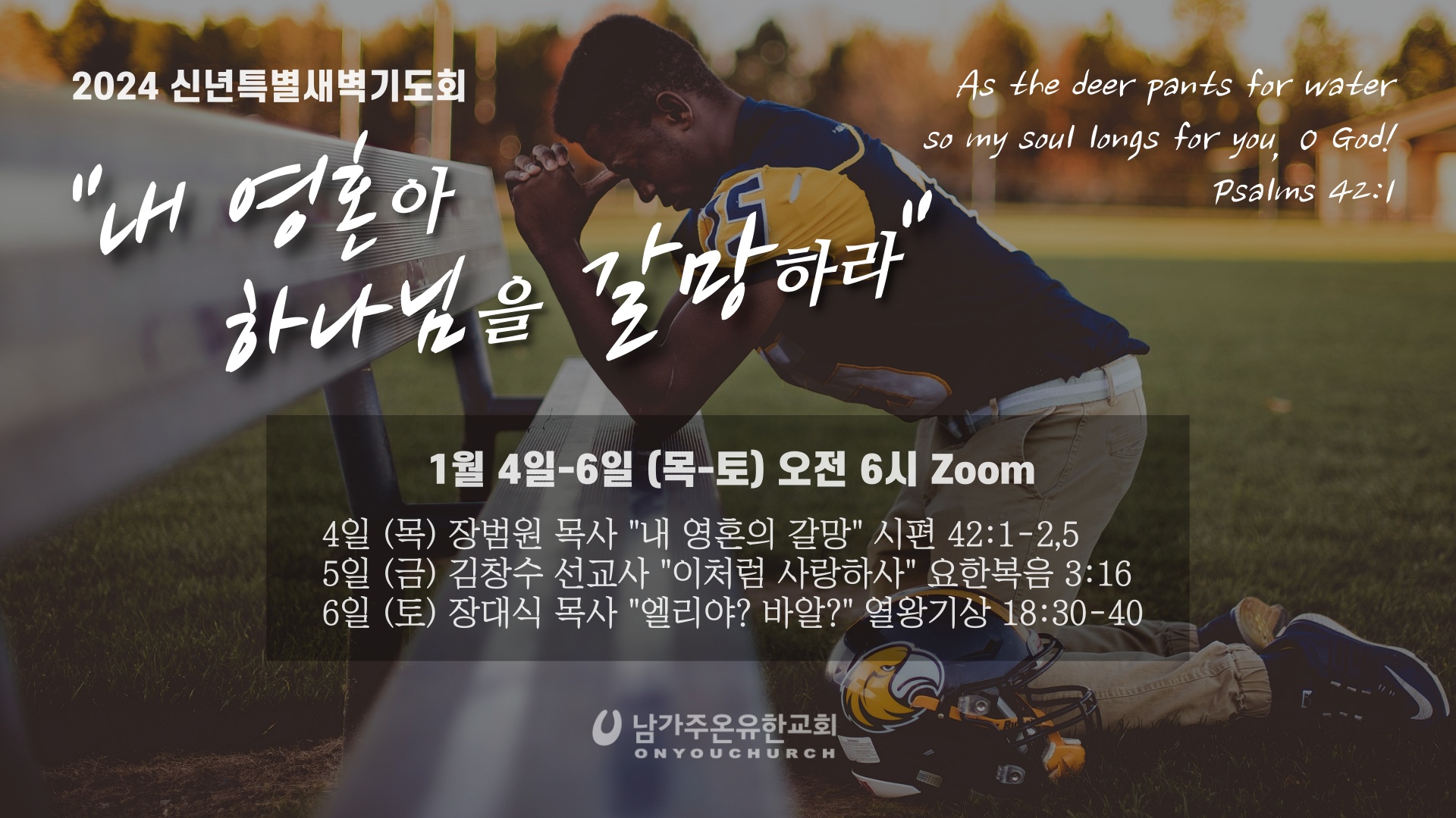 일정: 2024년 1월 4일~6일 (목~토) 오전 6시◼ 4일 (목) 장범원 목사 "내 영혼의 갈망" 시편 42:1-2,5 ◼ 5일 (금) 김창수 선교사 "이처럼 사랑하사" 요한복음 3:16 ◼ 6일 (토) 장대식 목사 "엘리야? 바알?" 열왕기상 18:30-40장소: Zoom (ID: 626 833 7787)