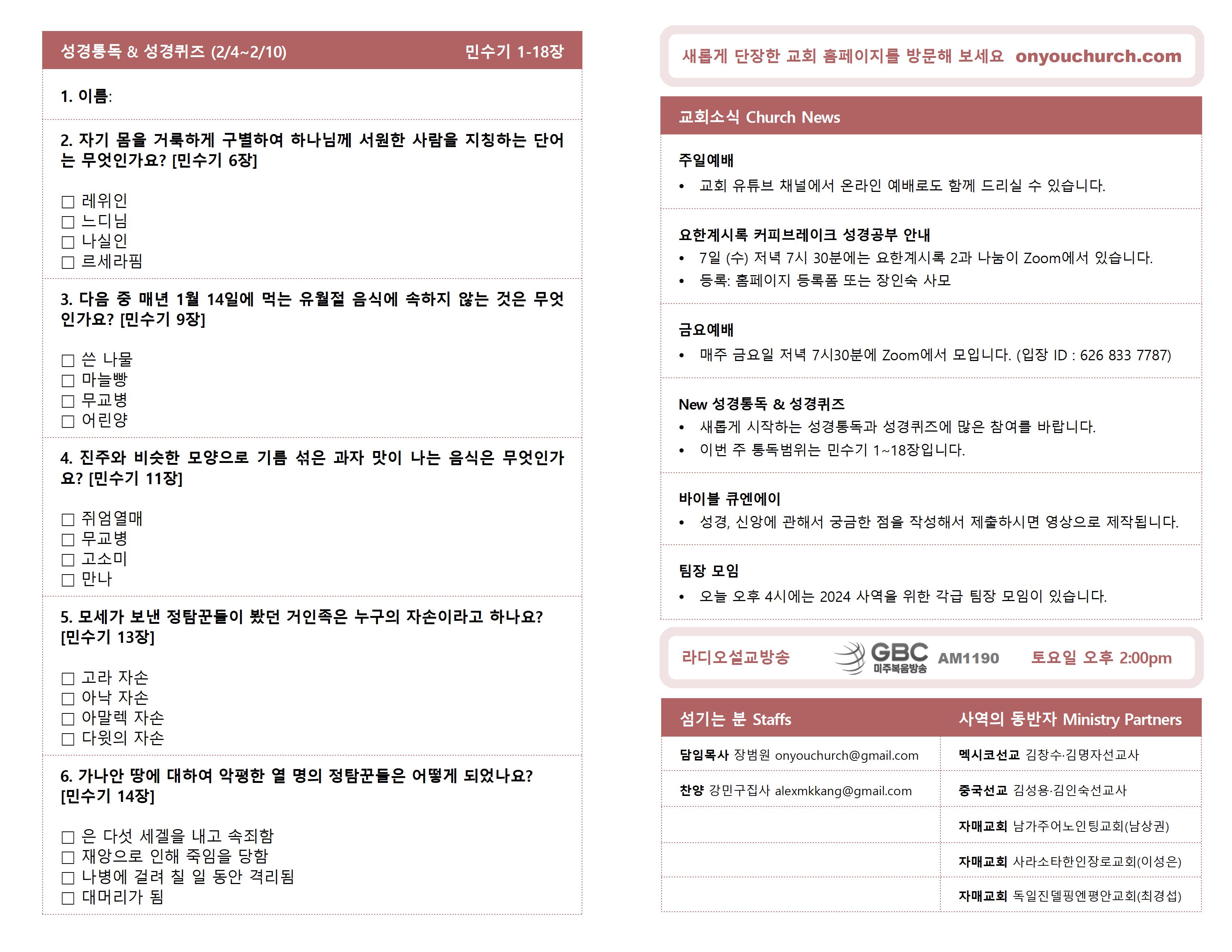 ◼ 새롭게 시작하는 성경통독과 성경퀴즈에 많은 참여를 바랍니다.