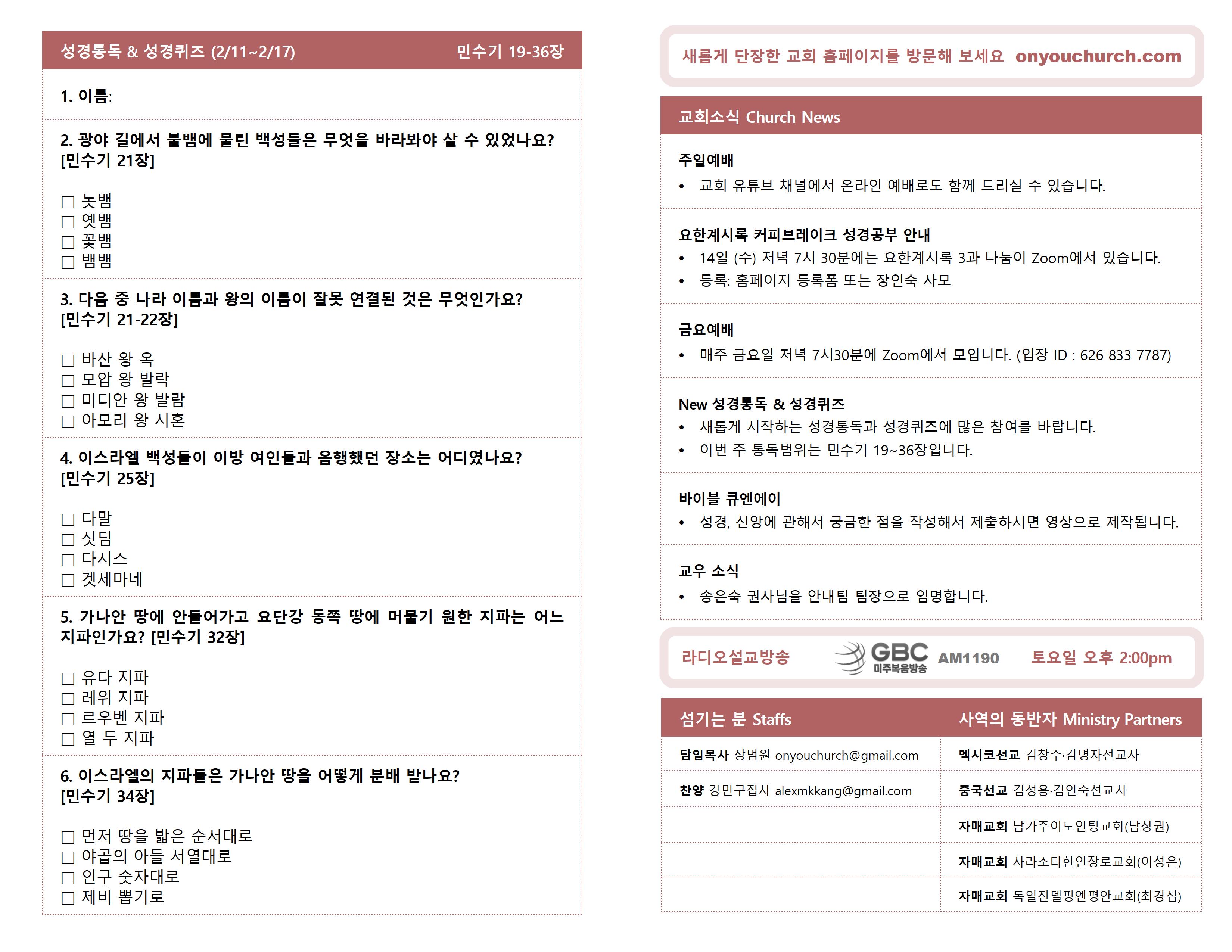 ◼ 새롭게 시작하는 성경통독과 성경퀴즈에 많은 참여를 바랍니다.