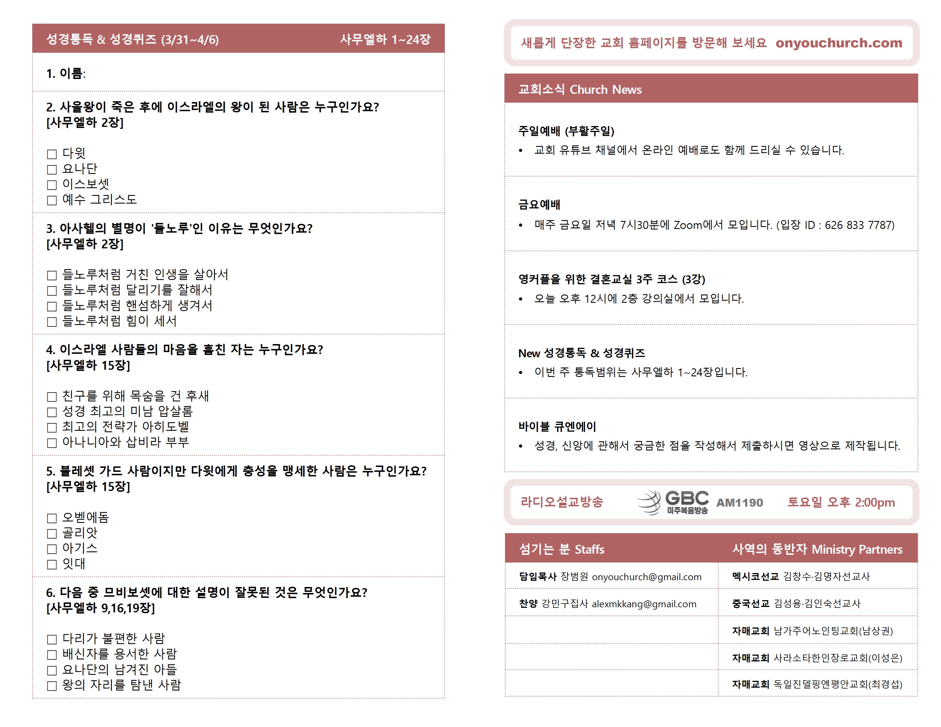 ◼ 이번 주 통독범위는 사무엘하 1~24장입니다.