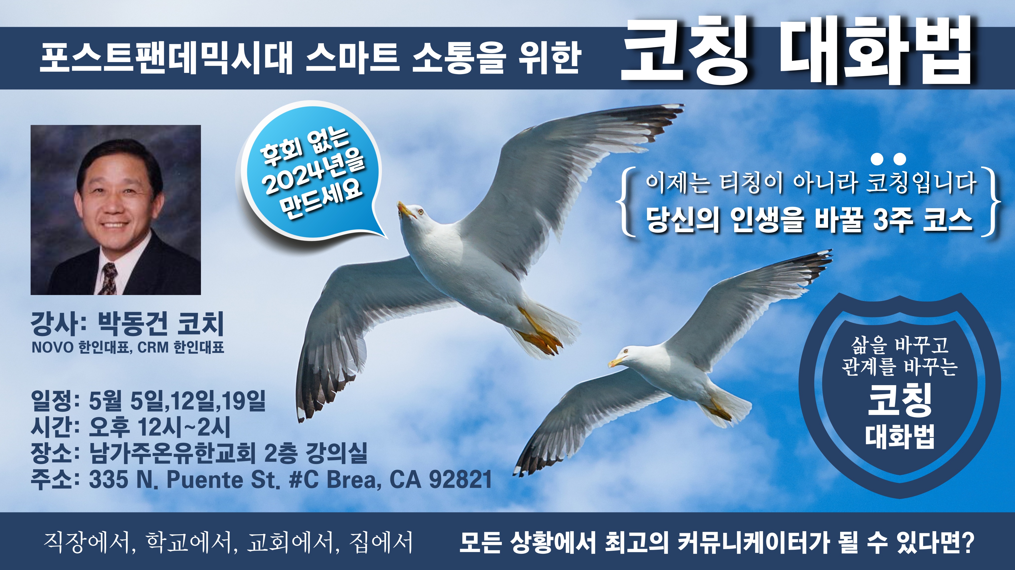 포스트 팬데믹 시대에 스마트한 소통을 위한 ‘코칭 대화법’ 강의가 5월 5일(주일)~19일까지 3주 코스로 열립니다. Novo 한인대표 박동건 목사님의 인도로 진행되며, 주일 오후 12시부터 2시까지 2층 강의실에서 모입니다. 직장, 학교, 교회, 가정 등 사회의 모든 자리에서 발생하는 여러 가지 다양한 상황에서 효과적인 커뮤니케이터가 될 수 있는 코칭 모델을 함께 배우고 코칭 기술들을 워크샵 방식으로 실습합니다. 스스로 문제를 진단하고 해답을 발견해 실제로 실행할 수 있도록 돕는 성인학습법 이론에 기초한 이번 코칭 강의를 통해 충만한 인간 관계와 폭넓은 사회 생활의 비결을 꼭 자신의 것으로 만드시기 바랍니다.