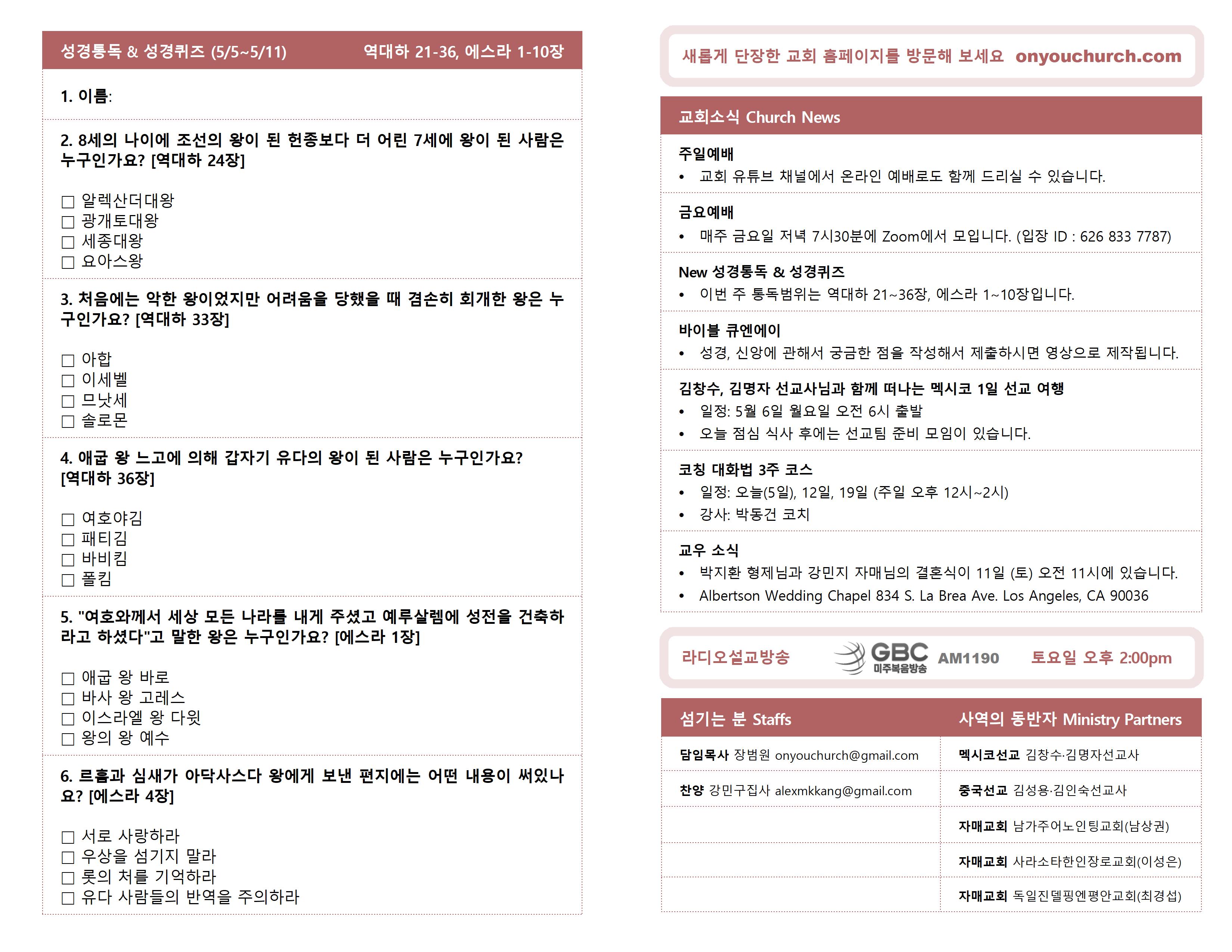 ◼ 일정: 5월 5일, 12일, 19일 주일 오후 12시~2시.