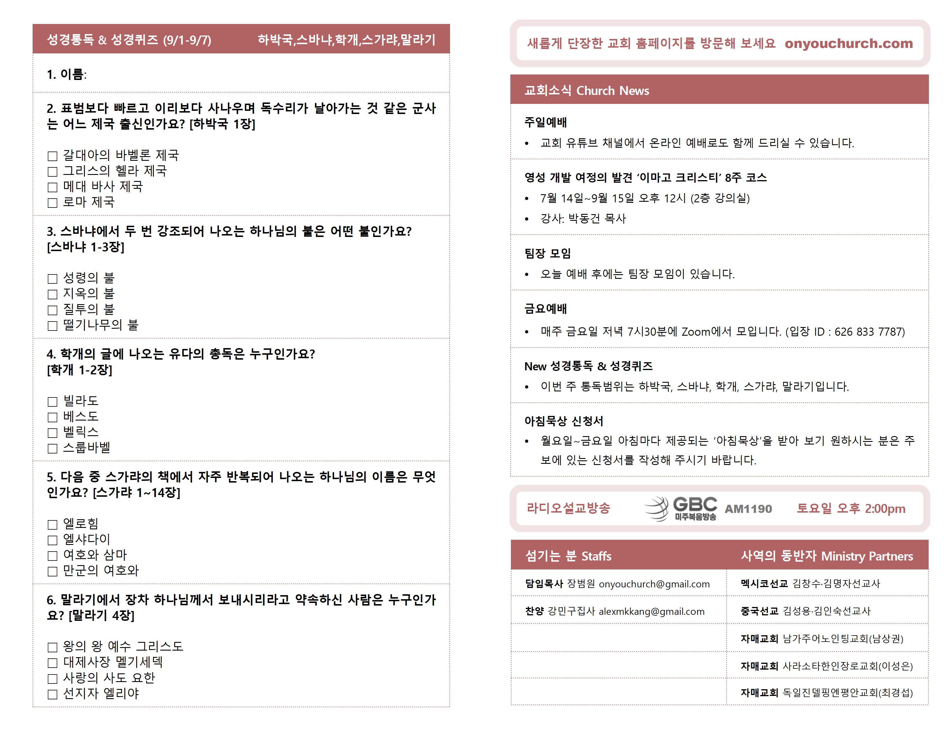 ◼ 이번 주 통독범위는 하박국, 스바냐, 학개, 스가랴, 말라기 입니다.