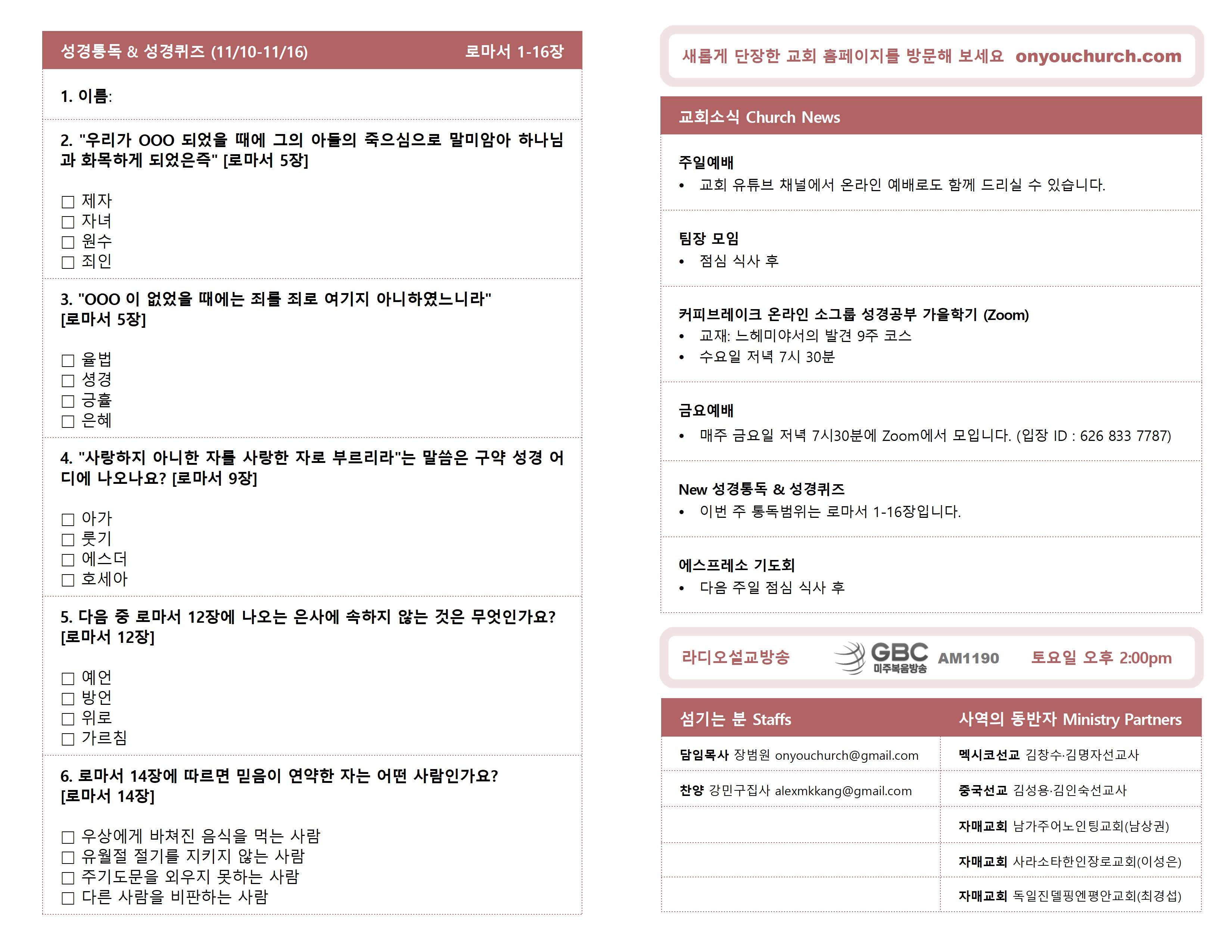 ◼ 이번 주 통독범위는 로마서 1-16장입니다.
