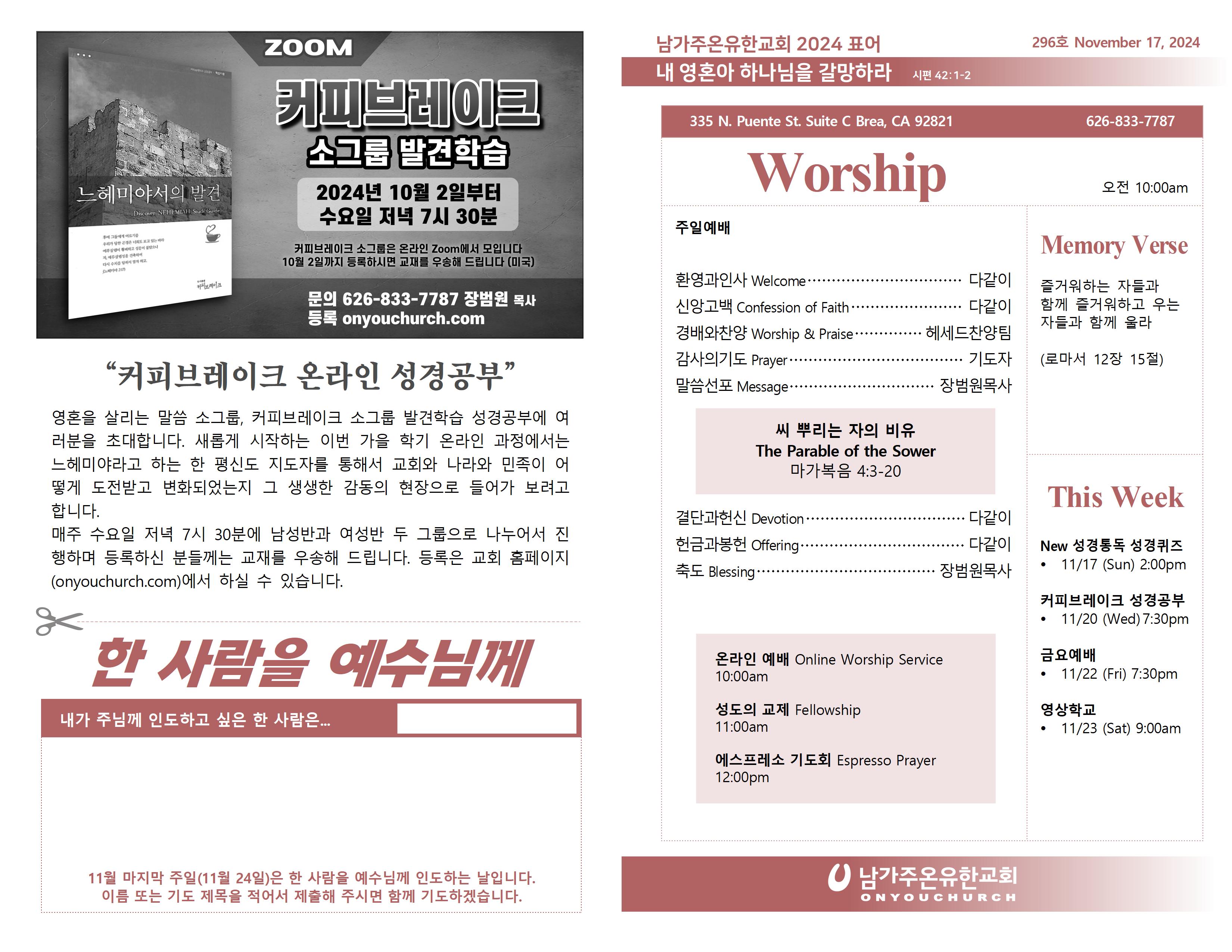 ◼ 다음 주일은 추수감사주일입니다. 감사의 계절을 맞아 추수감사 예물(과일, 쌀 등)을 자원하는 마음으로 준비해 주시기 바랍니다.