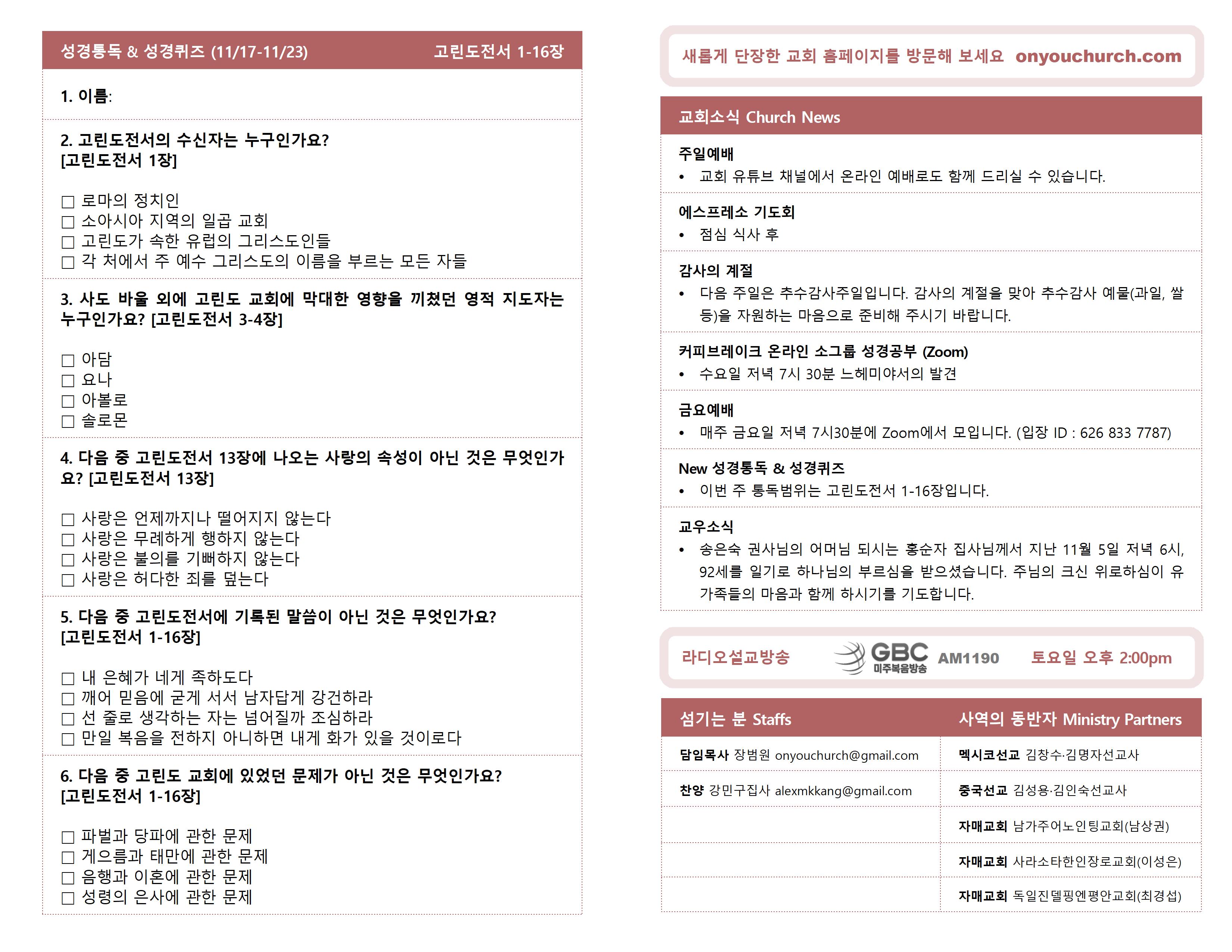 ◼ 이번 주 통독범위는 고린도전서 1-16장입니다.