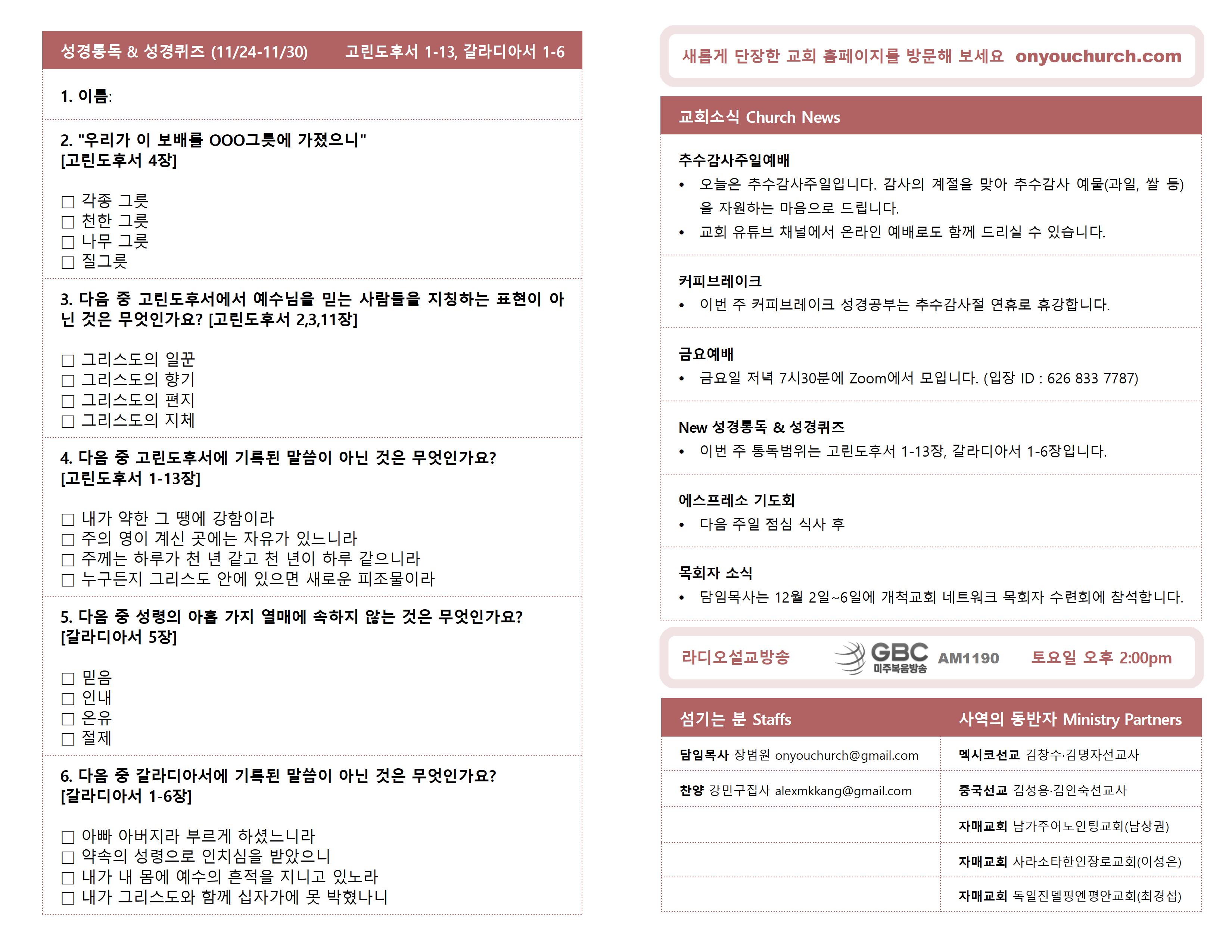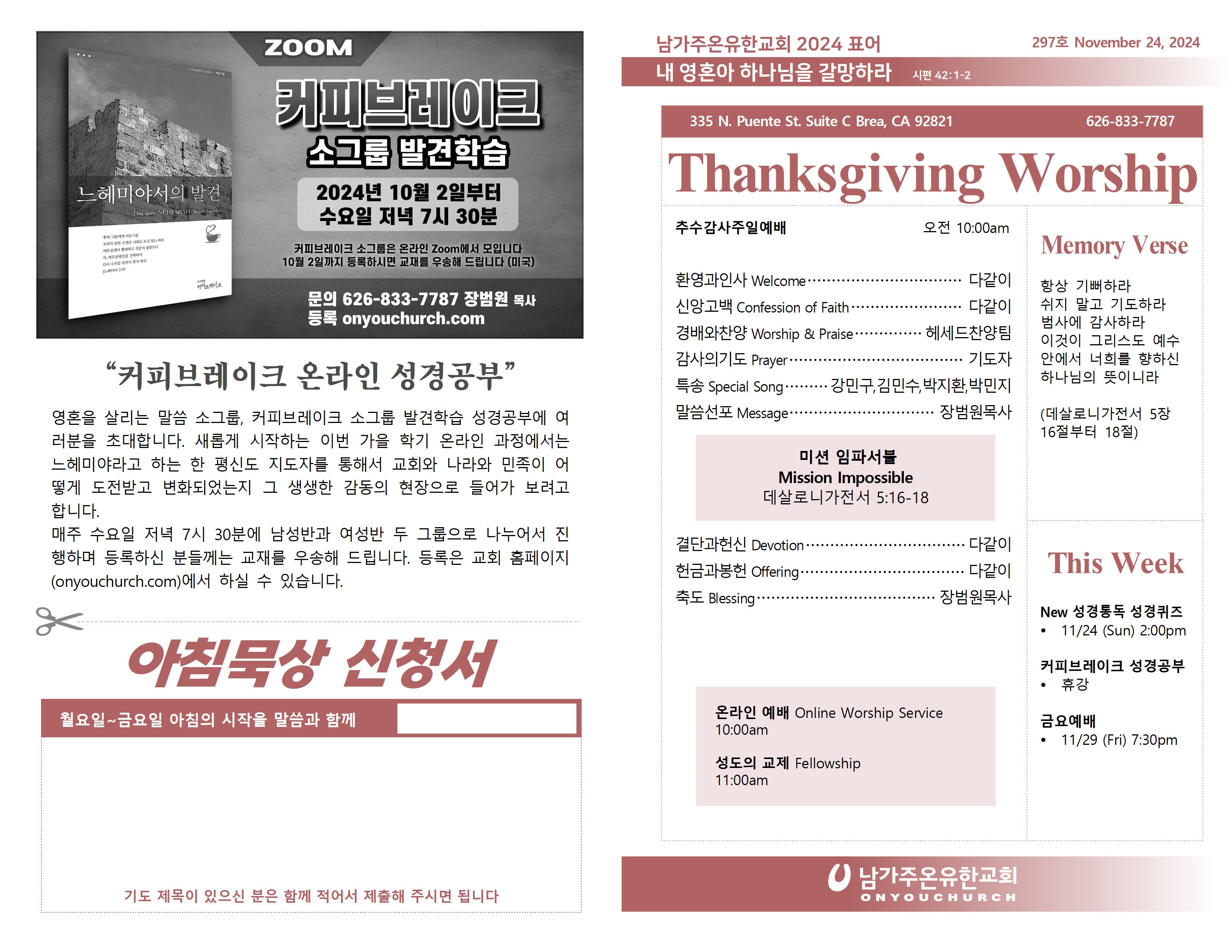 ◼ 이번 주 커피브레이크 성경공부는 추수감사절 연휴로 휴강합니다.