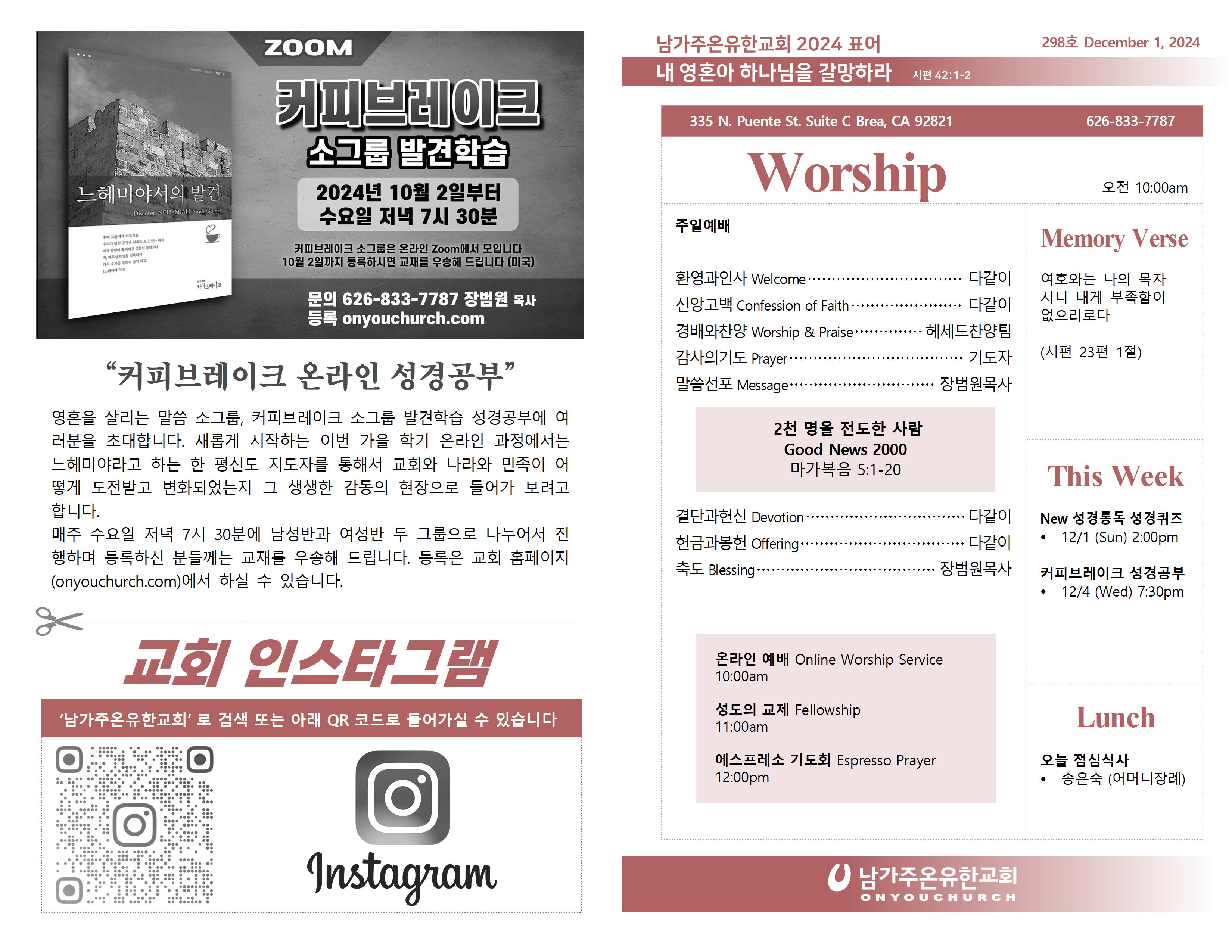 ◼ ‘남가주온유한교회’로 검색 또는 QR 코드로 들어가실 수 있습니다.