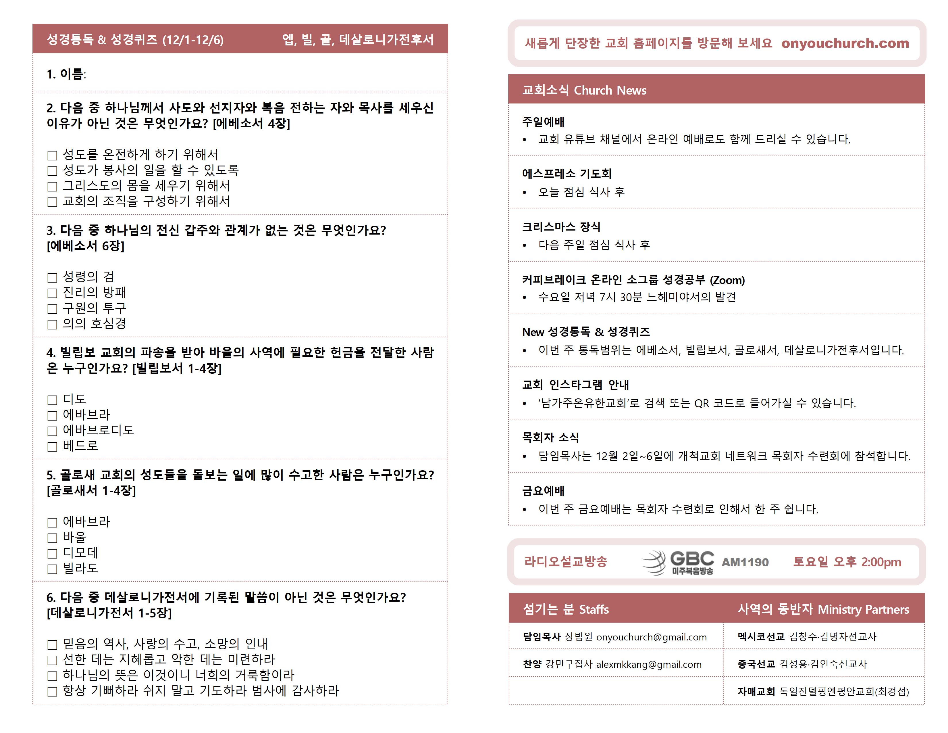 ◼ 이번 주 통독범위는 에베소서, 빌립보서, 골로새서, 데살로니가전후서입니다.