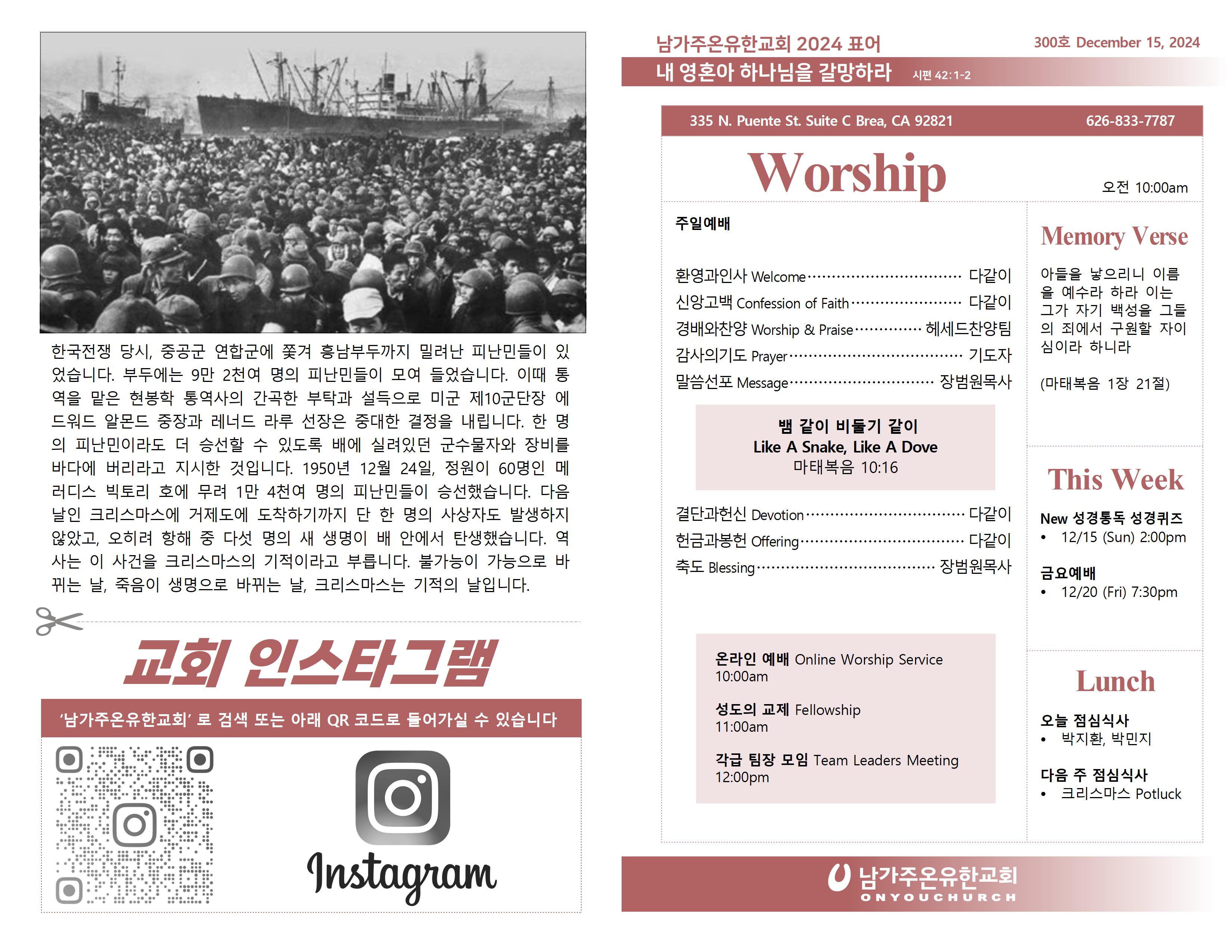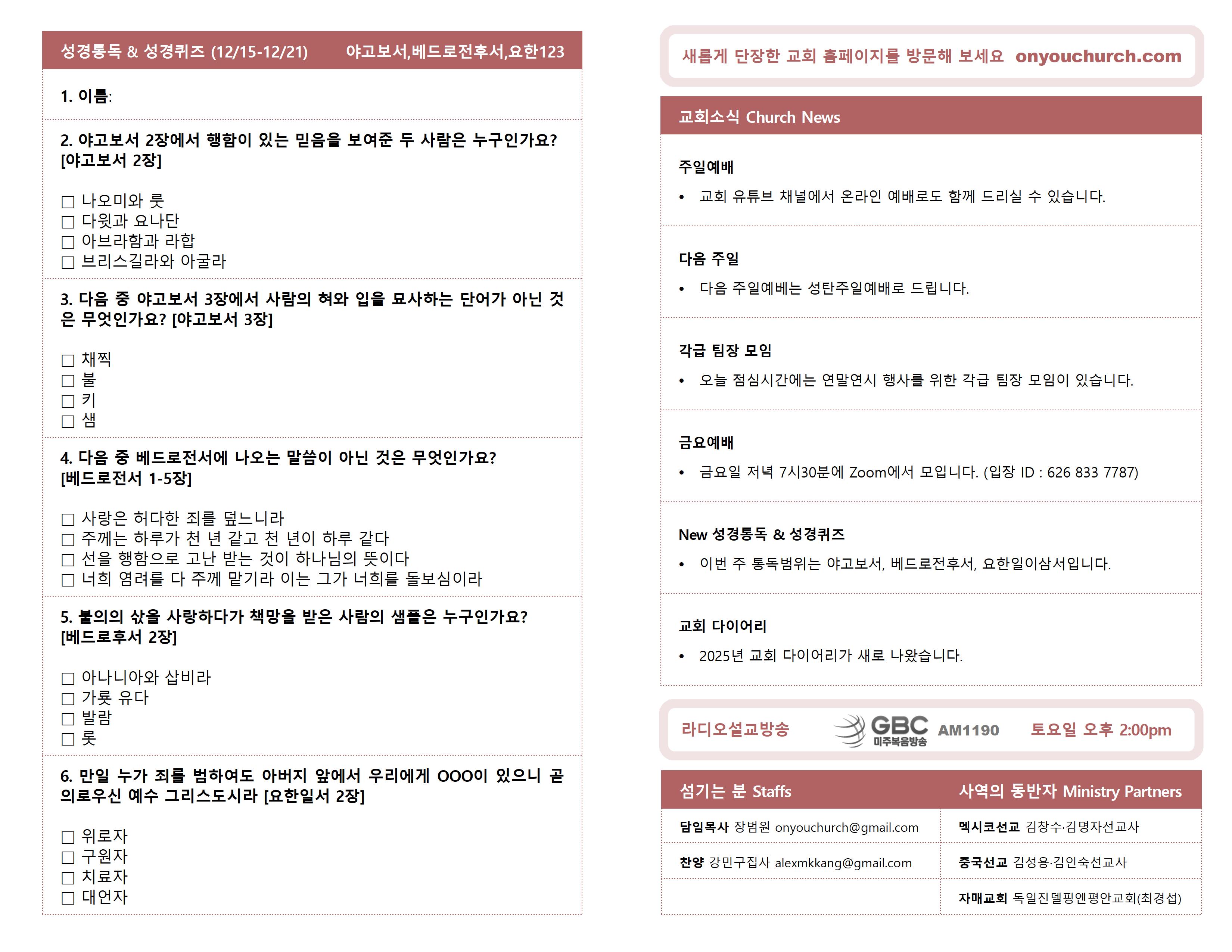 ◼ 다음 주일예베는 성탄주일예배로 드립니다.