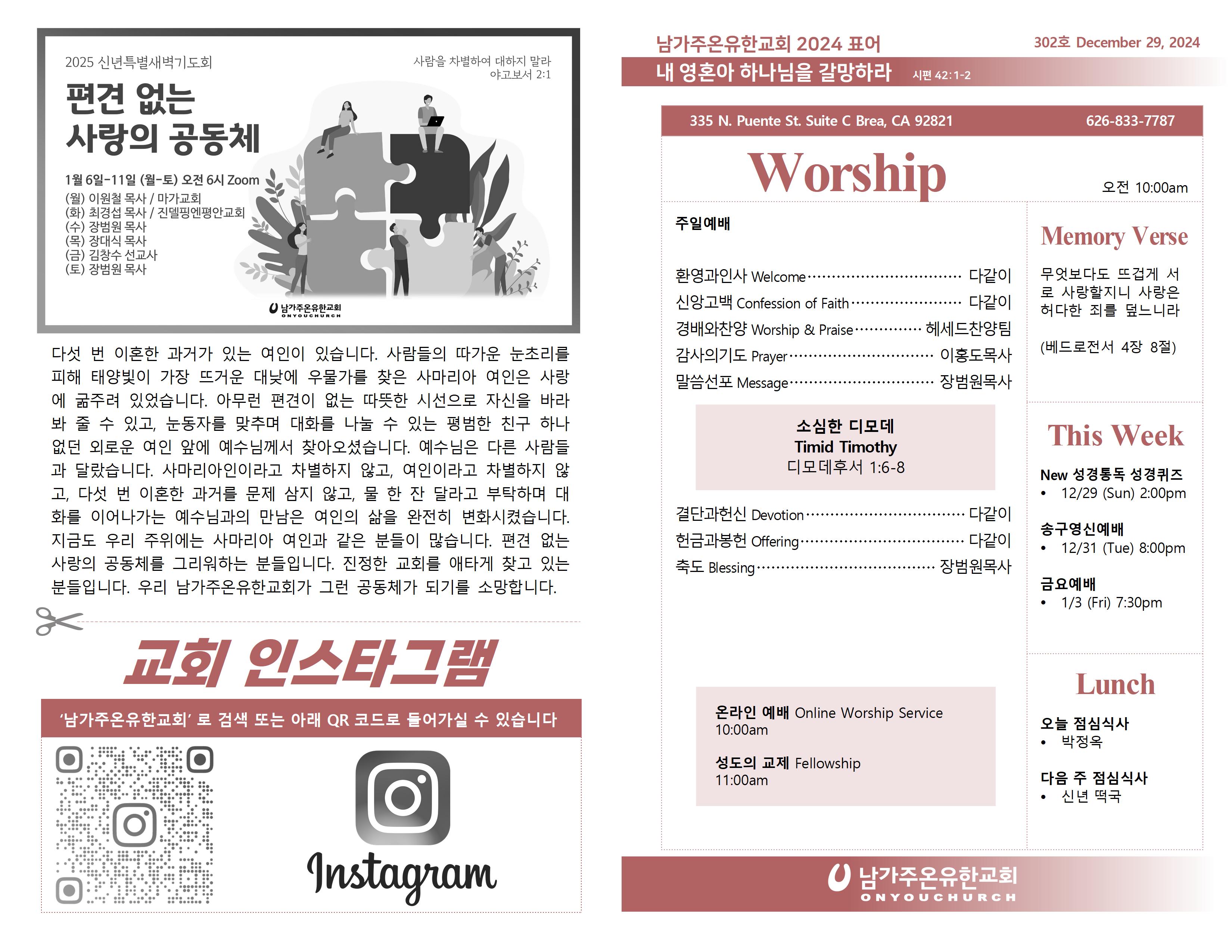 ◼ 다음 주일(5일) 예배는 신년주일예배로 드립니다.