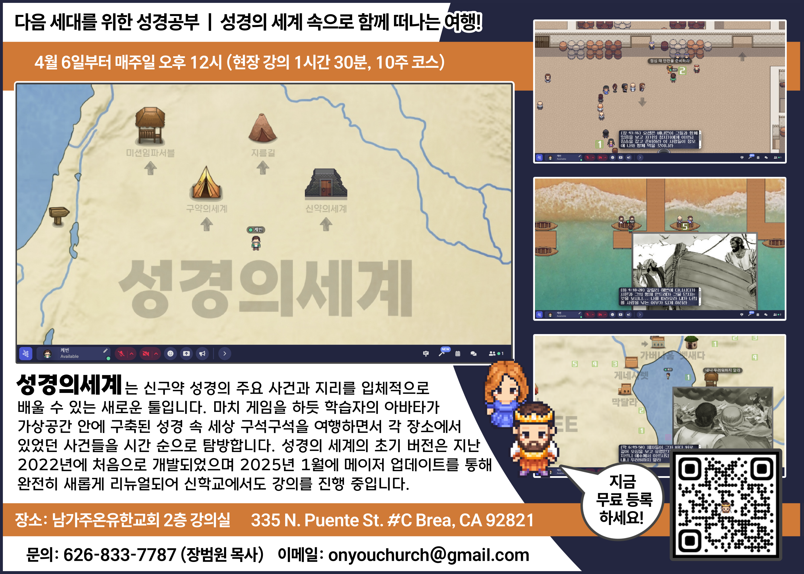 성경의 세계의 초기 버전은 지난 2022년에 처음으로 개발되었으며 2025년 1월에 메이저 업데이트를 통해 완전히 새롭게 리뉴얼 되어 신학교에서도 강의를 진행 중입니다.