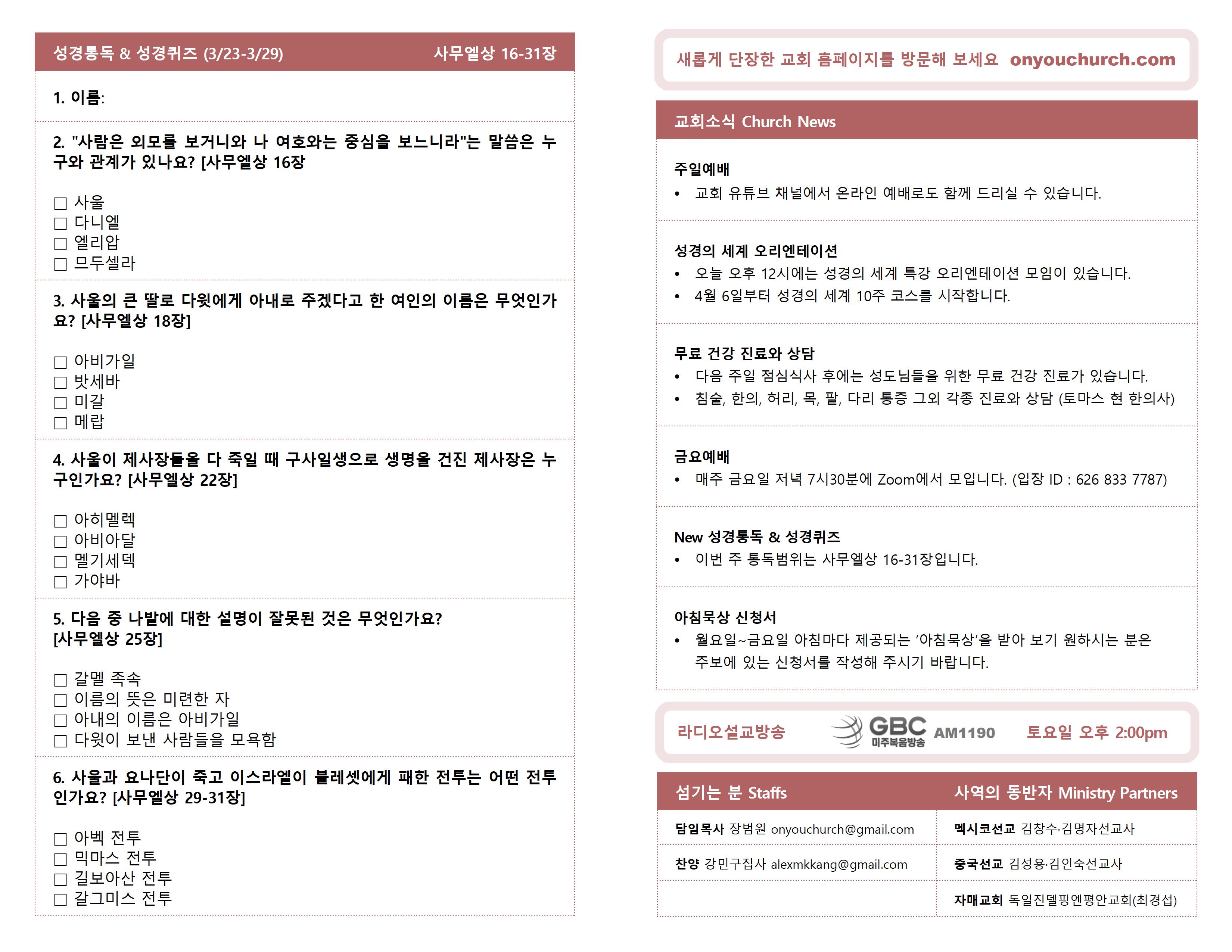 ◼ 이번 주 통독범위는 사무엘상 16-31장입니다.