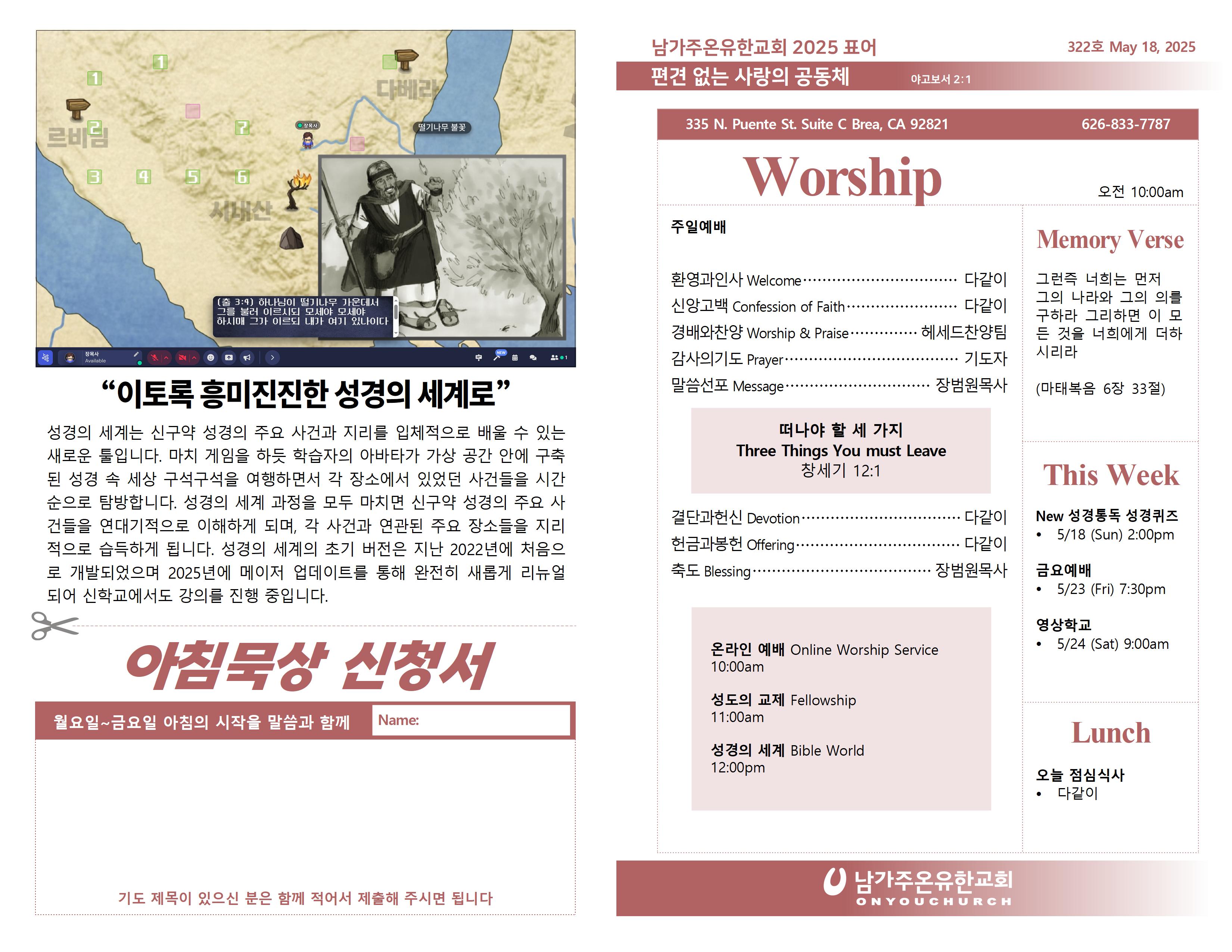◼ 다음 주일 점심식사 후에는 전교인 수련회 준비위원회 모임이 있습니다.