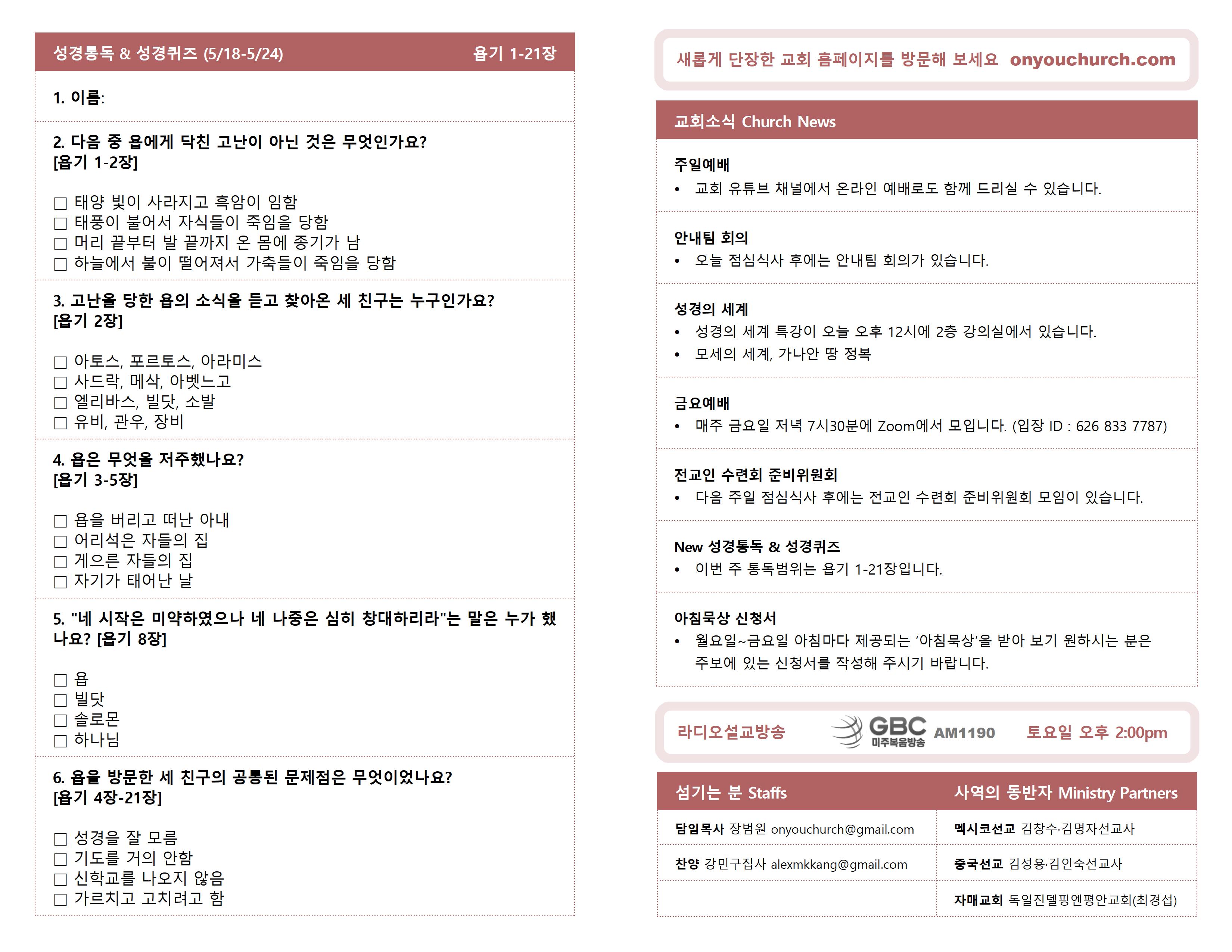 ◼ 이번 주 통독범위는 욥기 1-21장입니다.