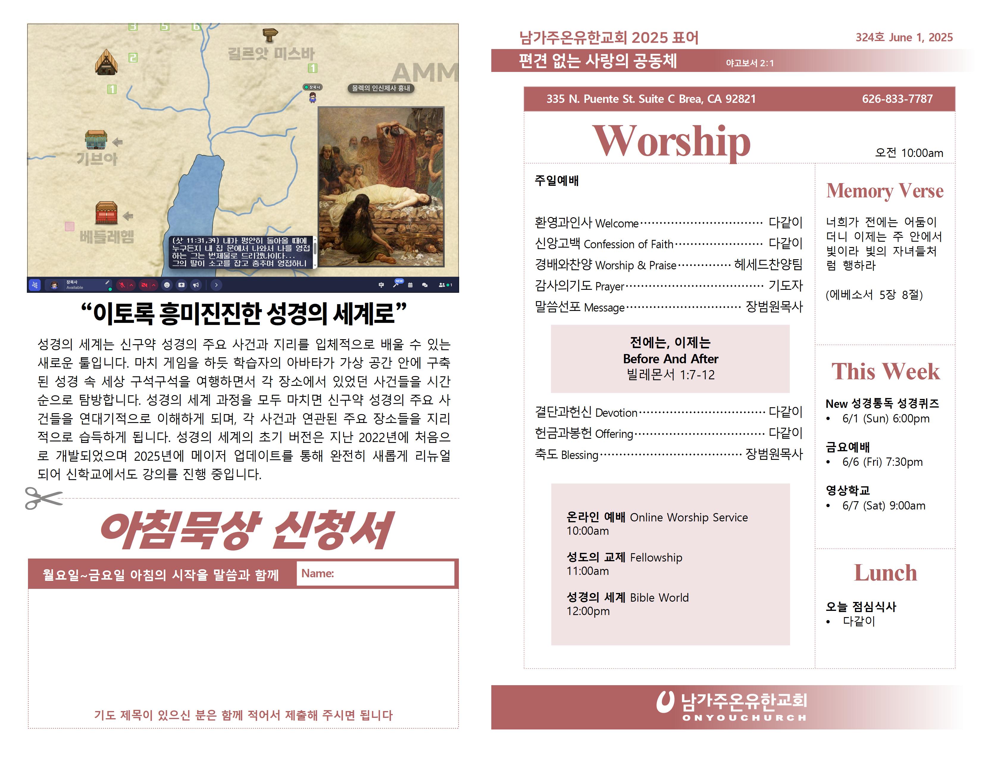 ◼ 월요일~금요일 아침마다 제공되는 '아침묵상'을 받아 보기 원하시는 분은 주보에 있는 신청서를 작성해 주시기 바랍니다.