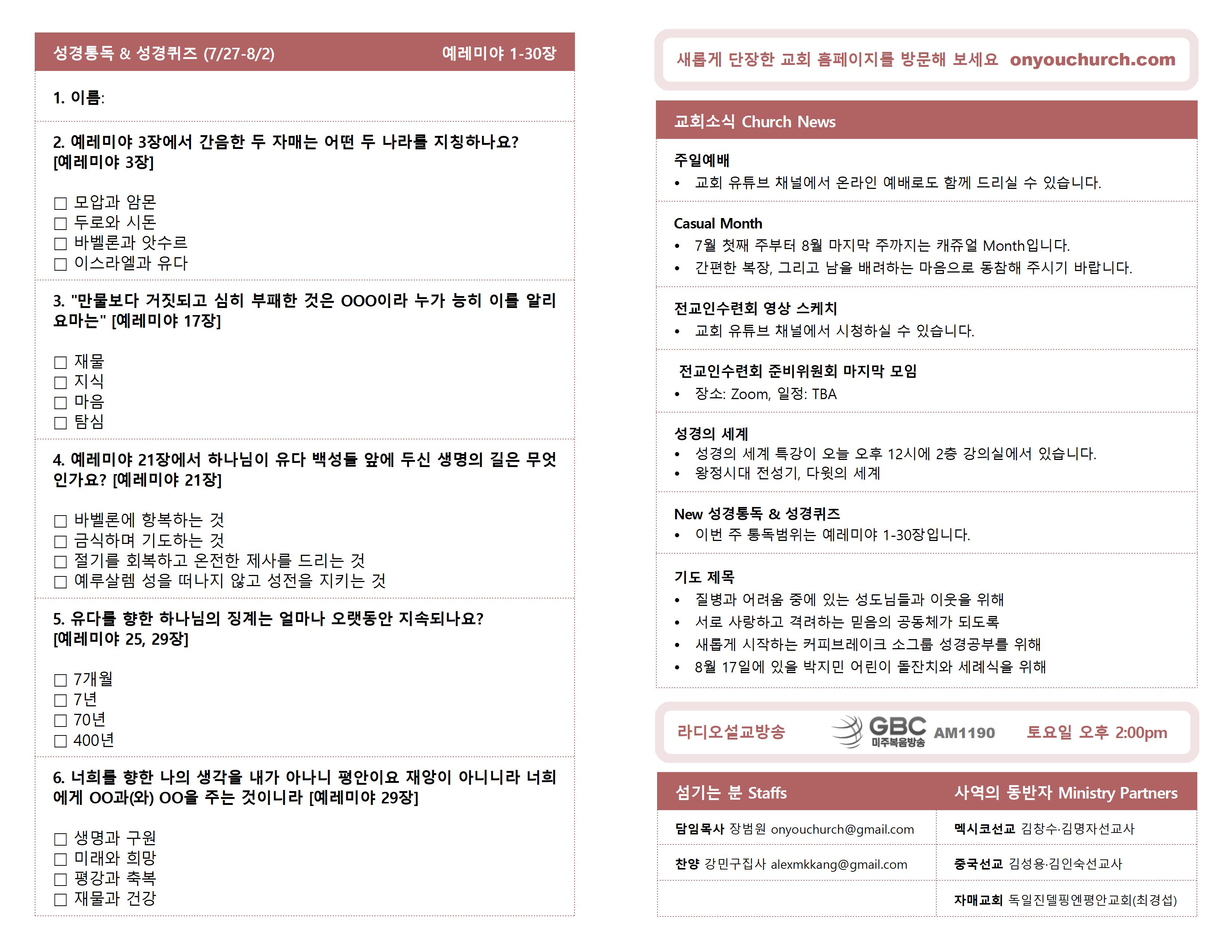 ◼ 이번 주 통독범위는 예레미야 1-30장입니다.