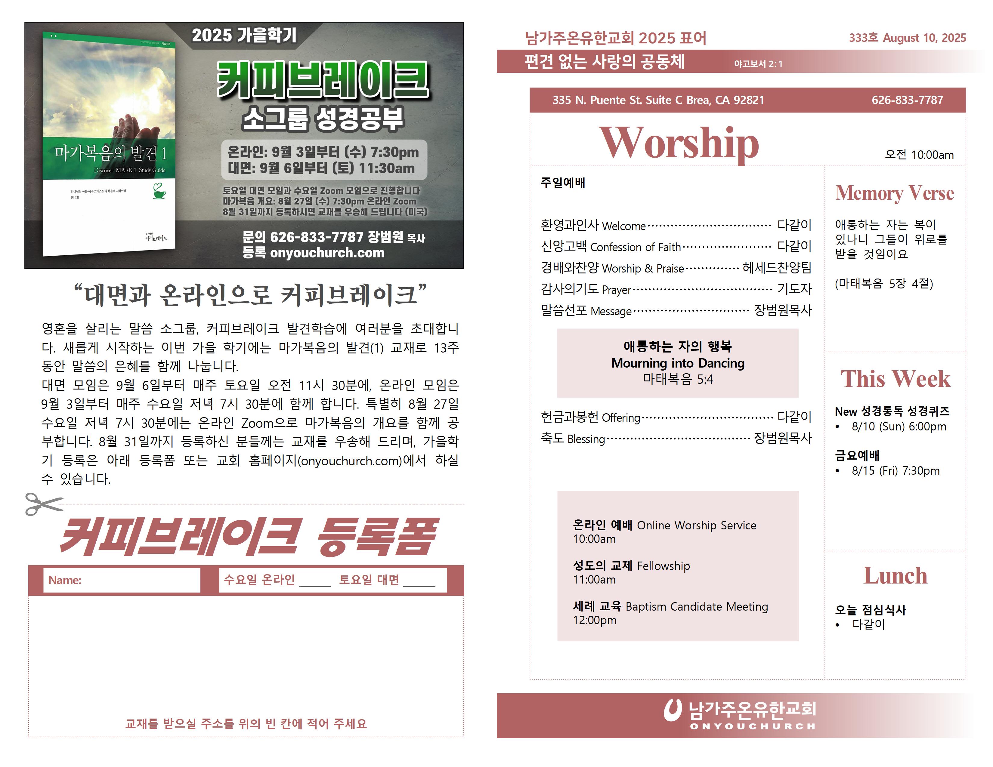 ◼ 온라인 Zoom: 9월 3일(수)부터 (7:30pm), 대면: 9월 6일(토)부터 (11:30am)